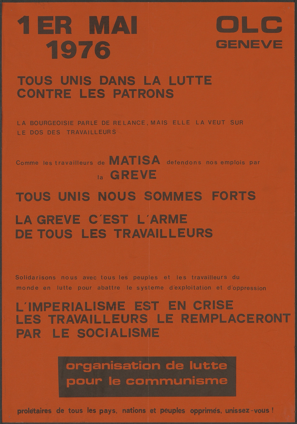 Affiche pour le 1er mai 1976, référence à la grève des travailleurs de Matisa.