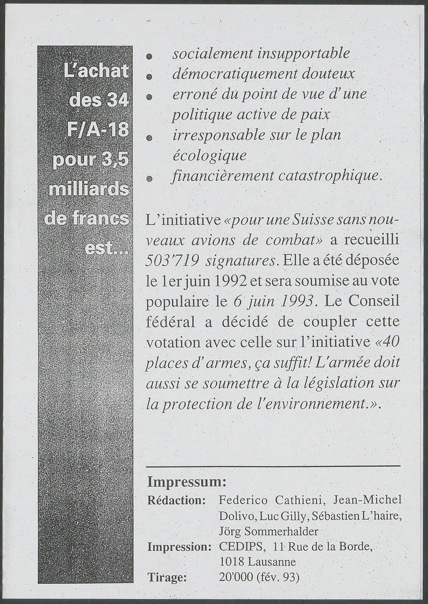 En 1992, le parlement décide de l’achat de 34 avions de combat F/A-18. Le GSsA lance une initiative pour une Suisse sans nouveaux avions de combat. En un mois, 503’519 signatures sont récoltées. Au mois de mai, suite à une initiative parlementaire, le principe d’un service civil est largement plébiscité par le peuple. La loi n’entrera en vigueur qu’en 1996, suite à d’âpres discussions parlementaires.