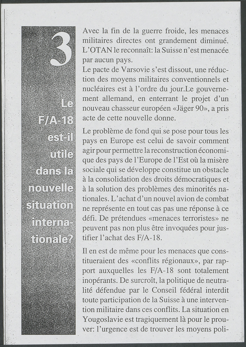 En 1992, le parlement décide de l’achat de 34 avions de combat F/A-18. Le GSsA lance une initiative pour une Suisse sans nouveaux avions de combat. En un mois, 503’519 signatures sont récoltées. Au mois de mai, suite à une initiative parlementaire, le principe d’un service civil est largement plébiscité par le peuple. La loi n’entrera en vigueur qu’en 1996, suite à d’âpres discussions parlementaires.