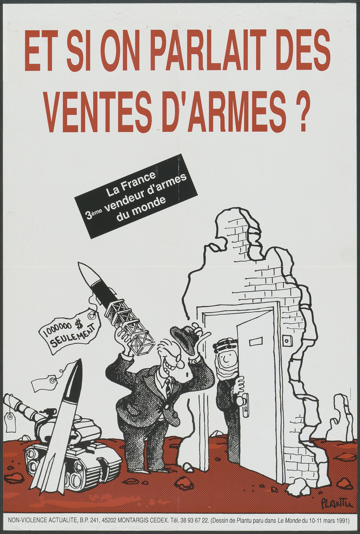 Affiche dénonçant le commerce des armes en France. Dessin de Plantu représentant un commercial proposant des armes à un homme en qamis et turban, devant une porte dans un mur en ruine.