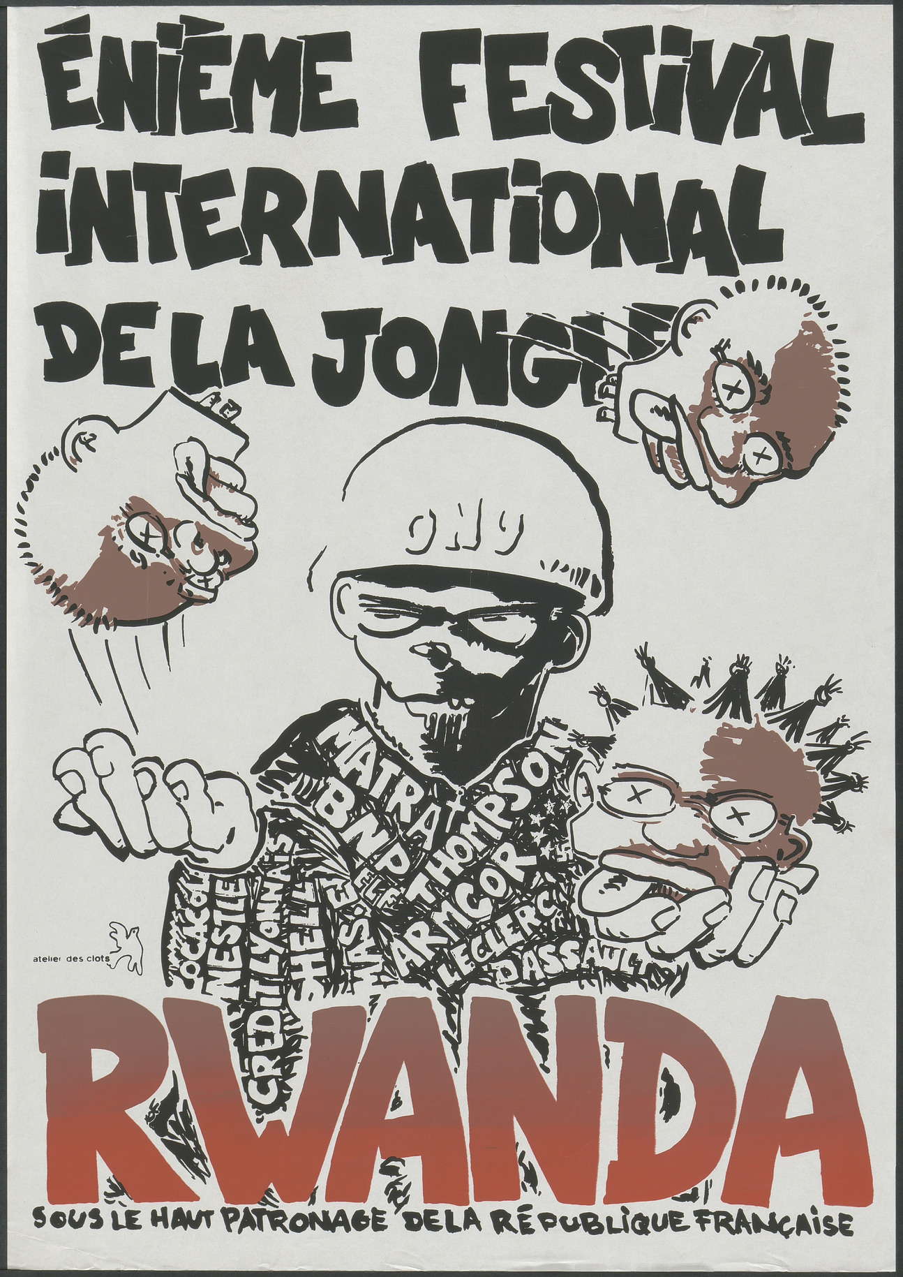 Un soldat jonglant avec des têtes coupées de personnes noires. Il porte un casque marqué « ONU » et les noms plusieurs grands groupes sont écrits sur son uniforme : BNP, Leclerc, Armgor, Nestlé, Crédit Lyonnais, Shell...