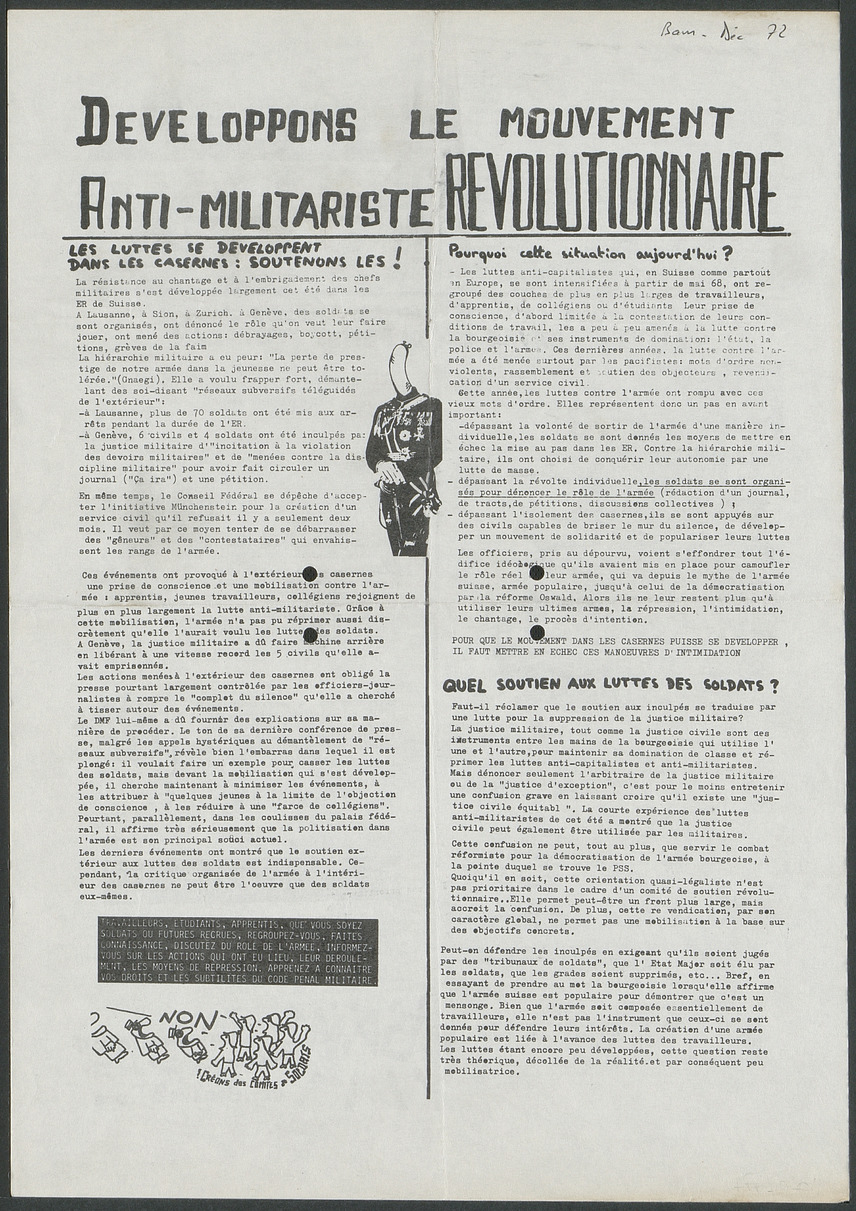 Affiche appelant à développer les luttes des recrues et des soldats à l'intérieur des casernes, à la création de comités de soldats, contre la défense totale. Revendications détaillées, chiffres.