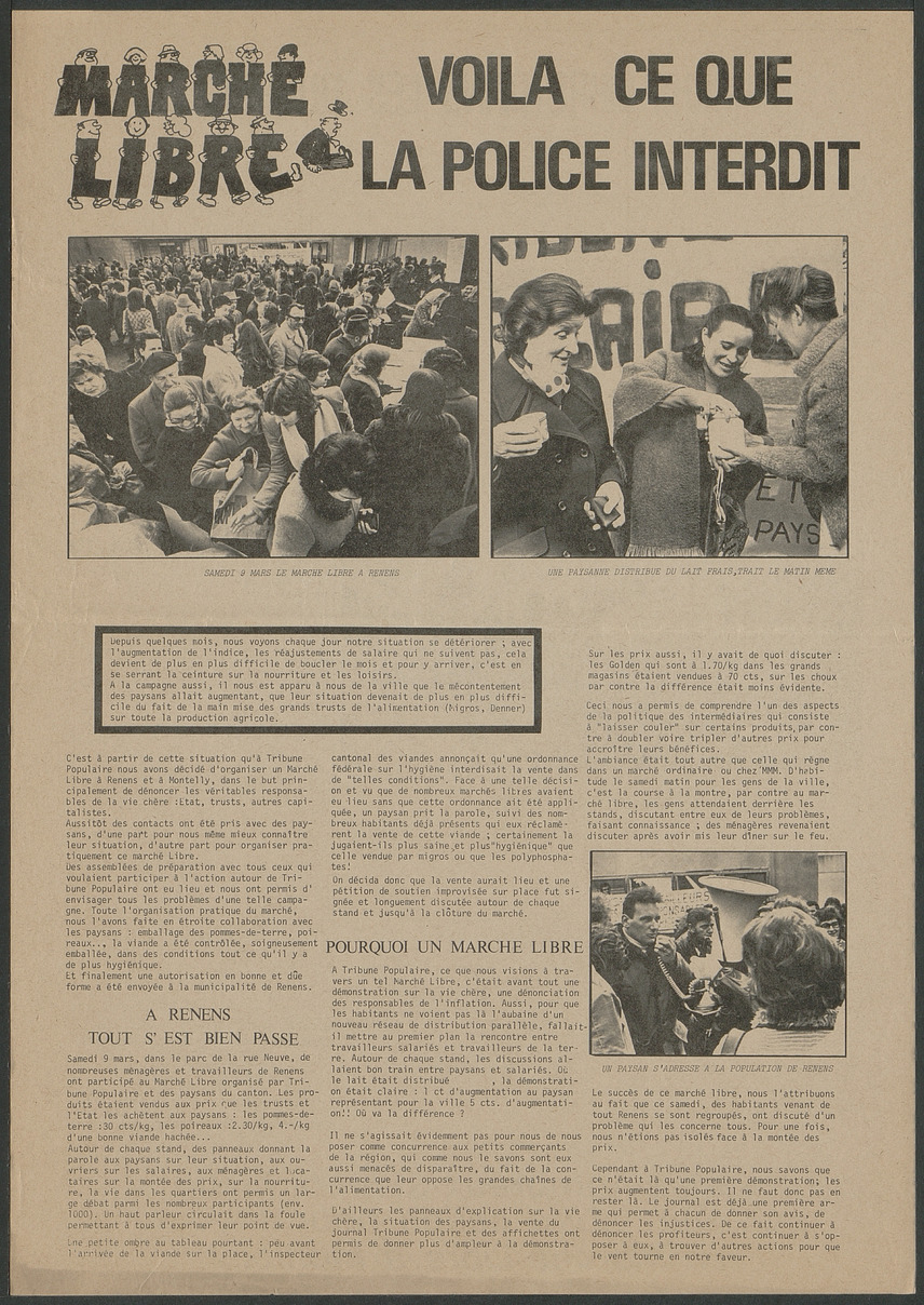 Affiche sur les marchés libres de Renens et Montelly organisés par Tribune populaire, dans le but « de dénoncer les véritables responsables de la vie chère : État, trusts, autres capitalistes ». Information sur la répression à Montelly. Images des marchés.