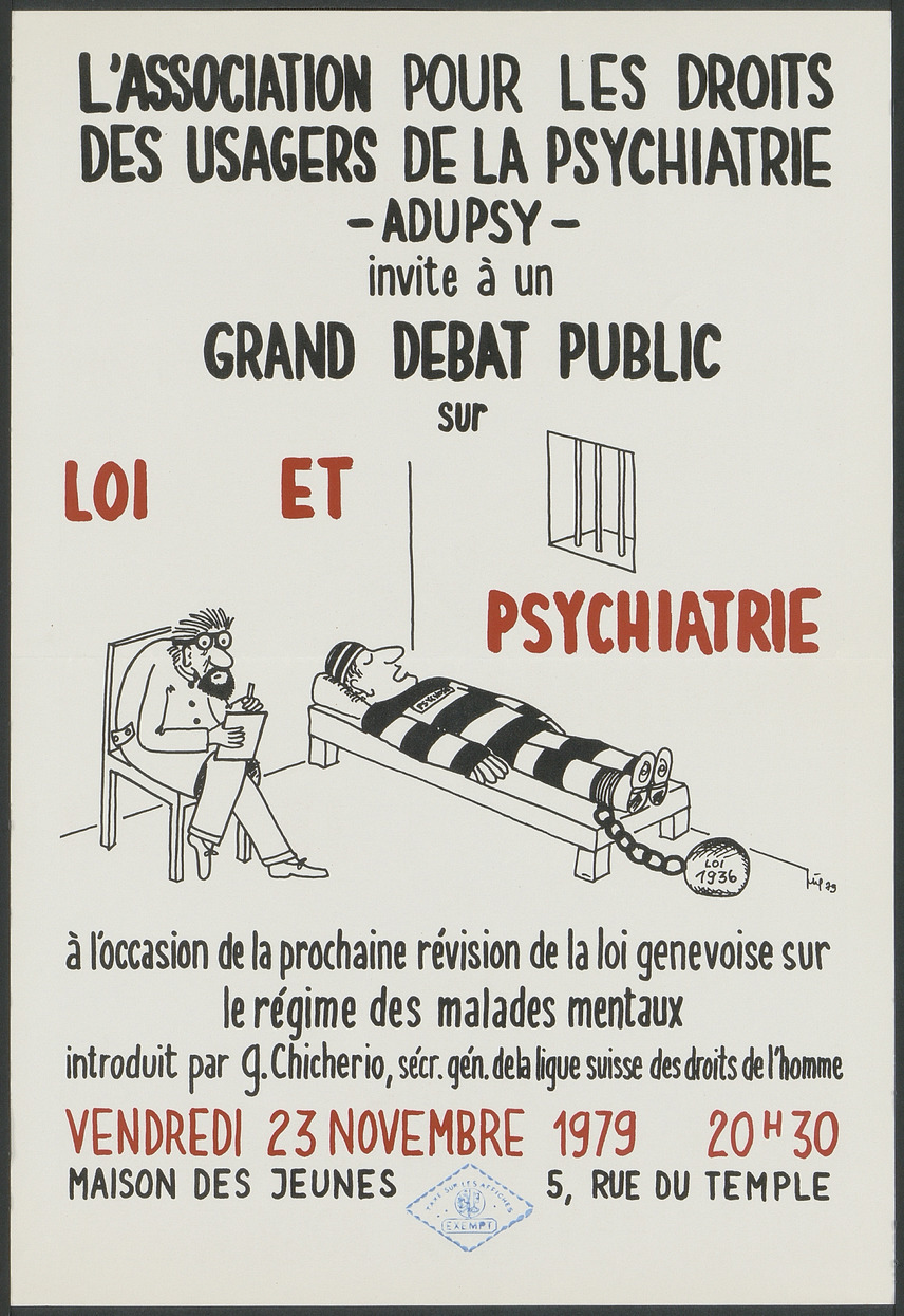 Appel à un débat public à l'occasion de la révision de la « loi sur le régime des personnes atteintes d’affections mentales ». On y voit un psychiatre et son patient, vêtu comme un prisonnier. Le patient porte à la cheville un boulet sur lequel il est écrit « loi 1936 », en référence au régime appliqué jusqu'alors au domaine de la psychiatrie.