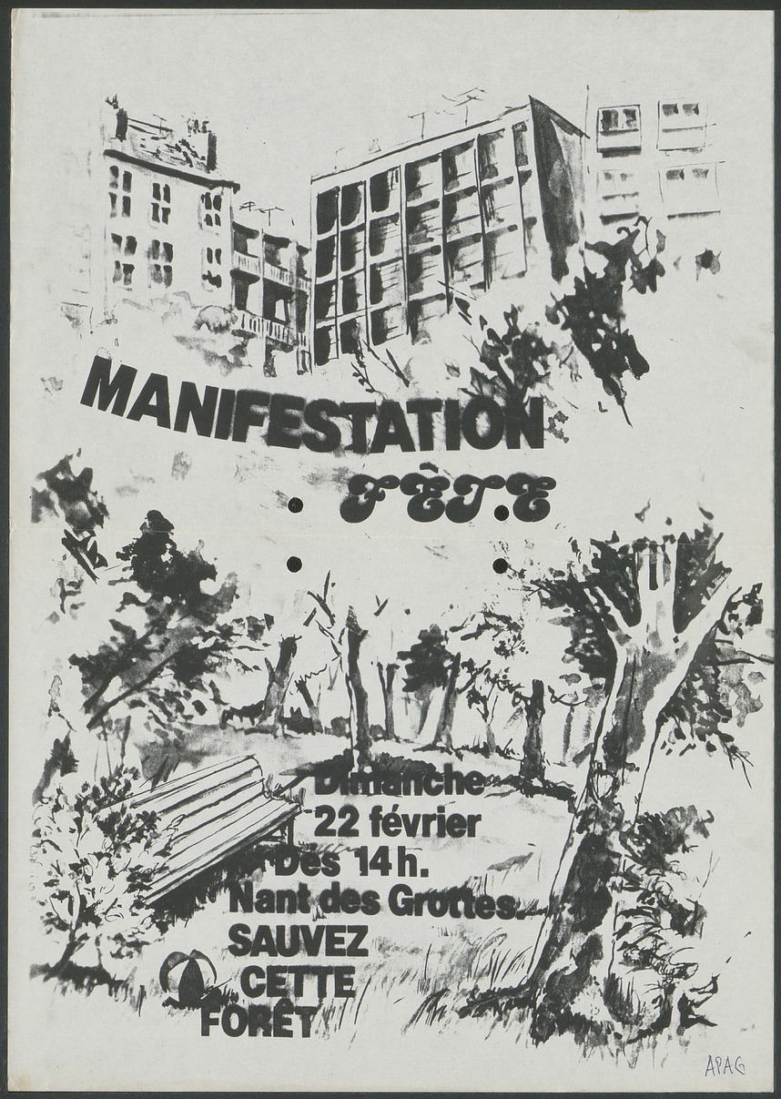 Affiche pour une "manifestation fête" le 22 février 1981. L'affiche, probablement peinte à l'encre de chine, représente une petite forêt et des immeubles du quartier en arrière plan, on peut y lire "sauvez cette forêt". La lecture du Canard des Grottes (N°2 et N°9) nous apprend qu'il s'agissait de s'opposer l'abattage de 38 arbres et à la destruction d'un terrain vague dans le haut des Grottes, la bataille est perdue le 31 mars 1981.