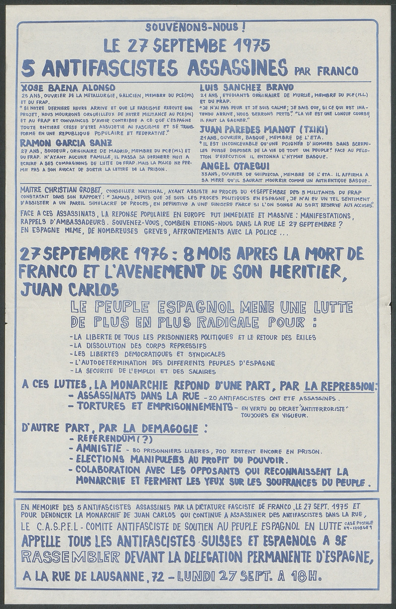 Affiche pour un rassemblement devant la délégation permanente d'Espagne pour protester contre la politique de répression menée par Juan Carlos et plus particulièrement contre les assassinats des antifascistes. Texte au verso.