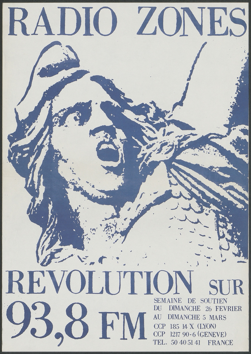Affiche pour une semaine de soutien à Radio Zones, coordonnées bancaires suisses et françaises au bas de l'affiche.