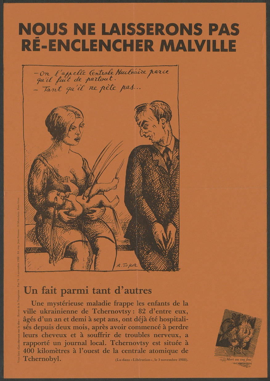 Le dessin de Topor représente une femme portant dans ses bras un bébé au corps troué duquel quelque chose fuit. Un homme les regarde. Le texte suivant est inscrit en haut du dessin : « - On l'appelle Centrale nucléaire parce qu'il fuit de partout. - Tant qu'il ne pète pas... ».