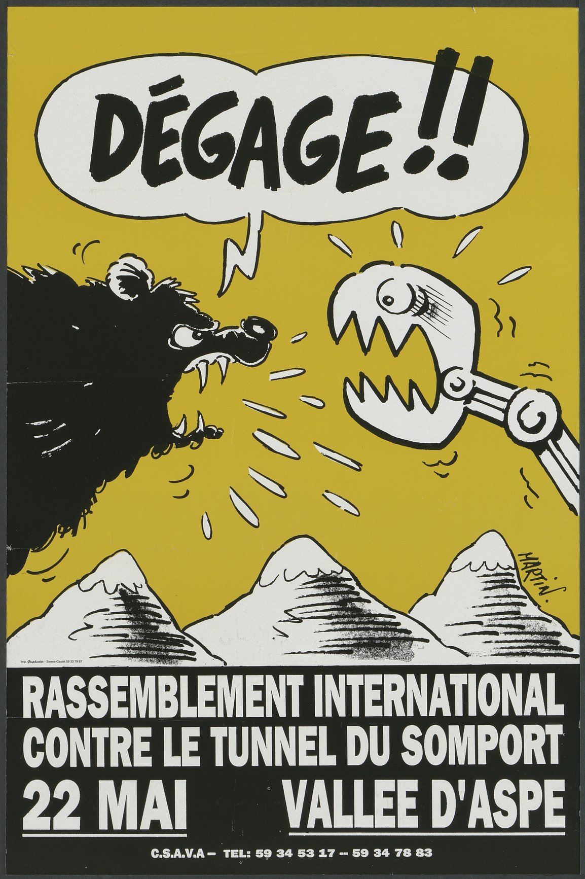 Affiche pour un rassemblement international à la Vallée d'Aspe, contre la construction du tunnel du Somport, reliant l'Espagne et la France à l'ouest de la chaîne pyrénéenne. Image représentant un ours criant « Dégage !! » à une pelle mécanique.
