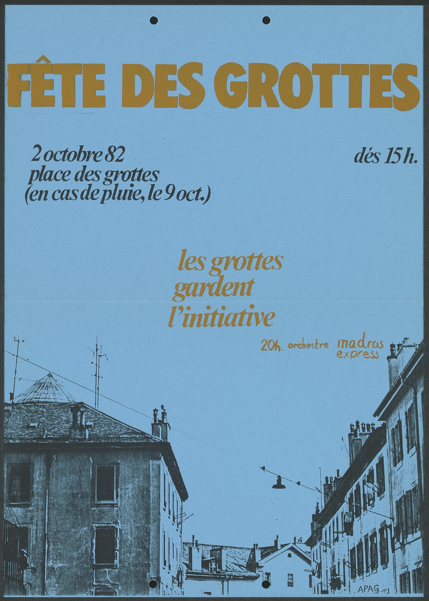 Affiche pour la "fête des Grottes", prévue pour le 2 octobre 1982 à la place des Grottes. Sur l'affiche on voit des immeubles du quartier et on lit "Les Grottes gardent l'initiative". Un concert de l'Orchestre Madras Express est également annoncé.