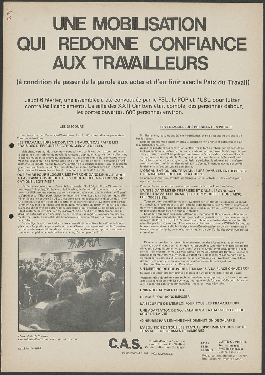 Le Comité d'action syndicale (CAS), basé à Lausanne, est actif dans toute la Suisse romande. Une large part de son activité consiste en la publication du périodique Lutte ouvrière, éditeur responsable J.-L. Mello. Entre 10 et 12 numéros par an paraissent de 1973 à 1979. Le CAS suit l'ensemble des luttes sur les lieux de travail en Suisse. Dans les cas des conflits qui se déroulent en Suisse romande, il publie également des tracts, des affiches et autres matériels de soutien et de popularisation. Une branche genevoise du CAS (le Groupe d'action syndicale) existe brièvement à Genève.
