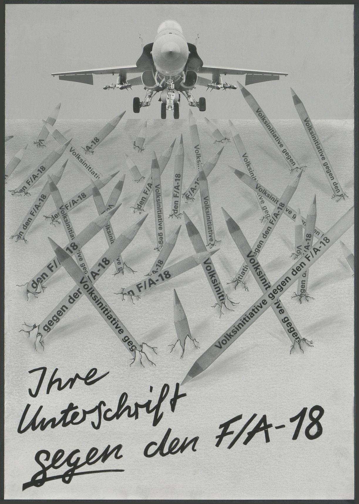 Affiche pour la récolte des signatures afin de déposer l'initiative populaire « pour une Suisse sans nouveaux avions de combat ». Image représentant un avion empêché d'atterrir par des crayons qui transpercent le sol.