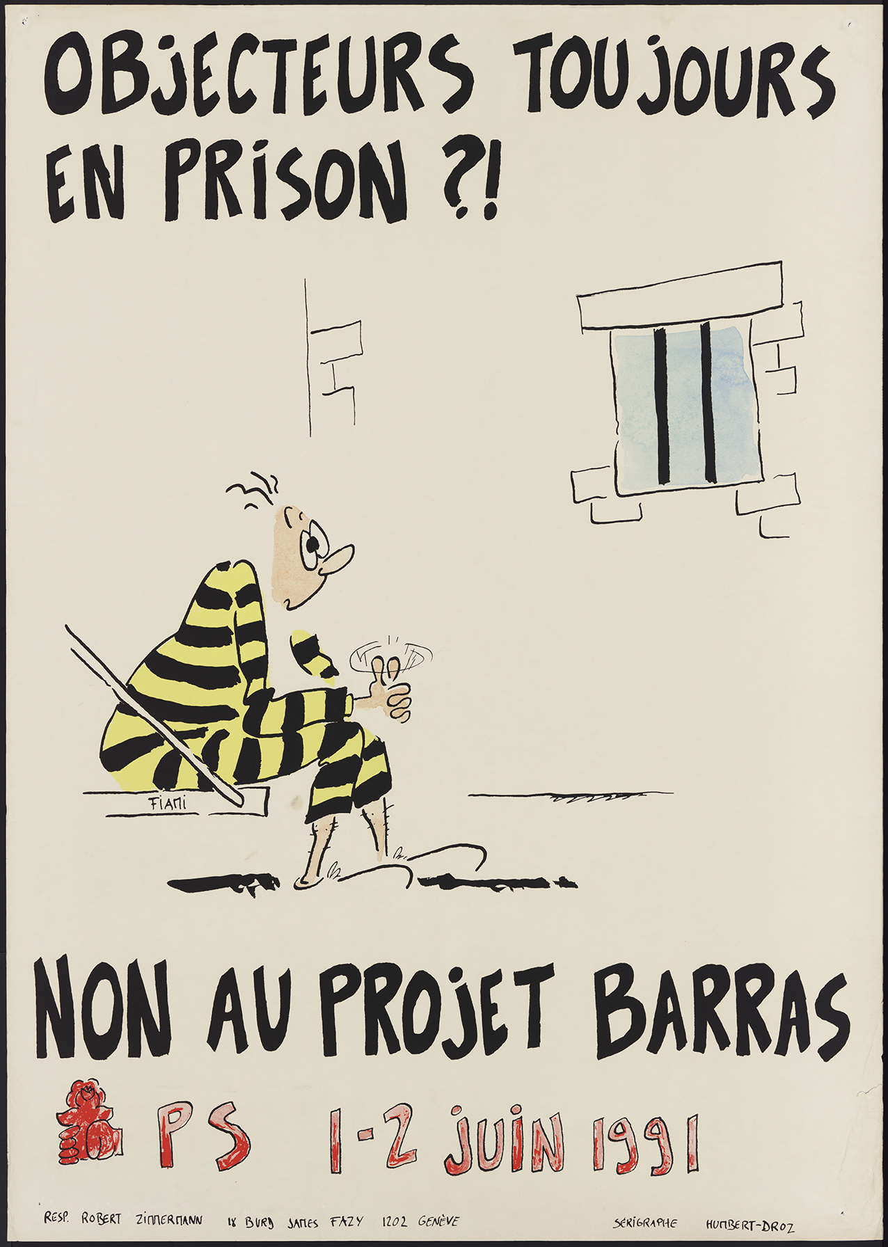 Affiche contre le « projet Barras », une révision du Code pénal militaire. Cette réforme est une décriminalisation partielle de l'objection de conscience qui « [permettrait] aux objecteurs d'effectuer, en lieu et place d'une peine privative de liberté, une astreinte à un travail d'intérêt général (d'une durée une fois et demie plus longue que le service militaire refusé) », des travaux d'intérêt public assumés jusque là par l'armée. (source : Année politique suisse).