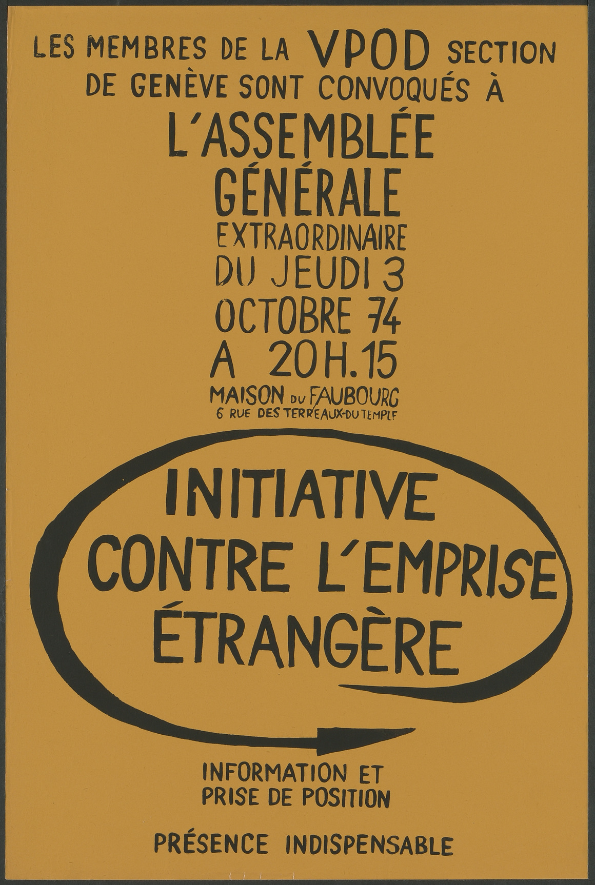 Convocation aux membres du VPOD pour une assemblée générale extraordinaire au sujet de l'initiative populaire « contre l'emprise étrangère et le surpeuplement de la Suisse ».