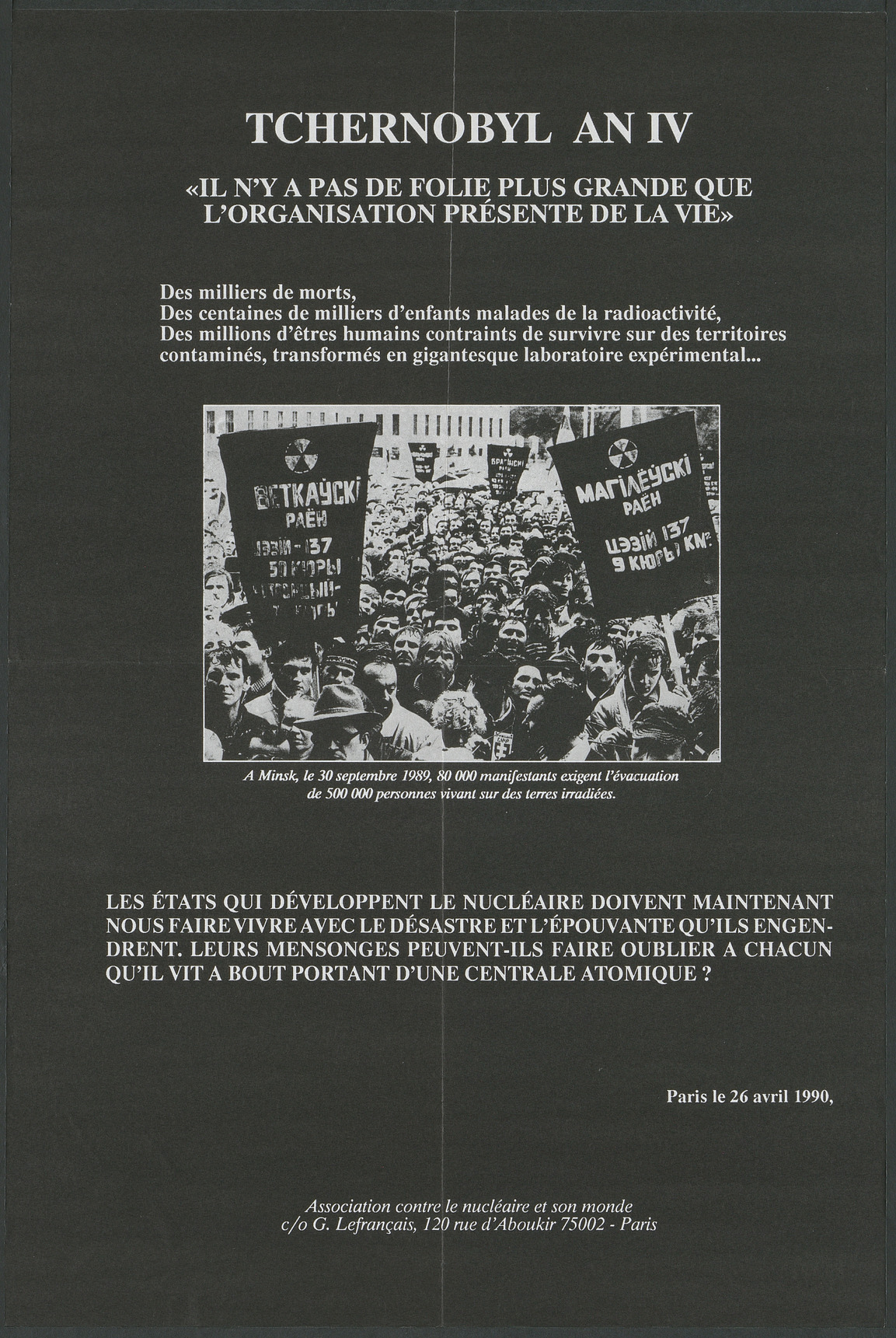 Affiche commémorative 4 ans après la catastrophe nucléaire de Tchernobyl. Photographie de manifestants à Minsk.