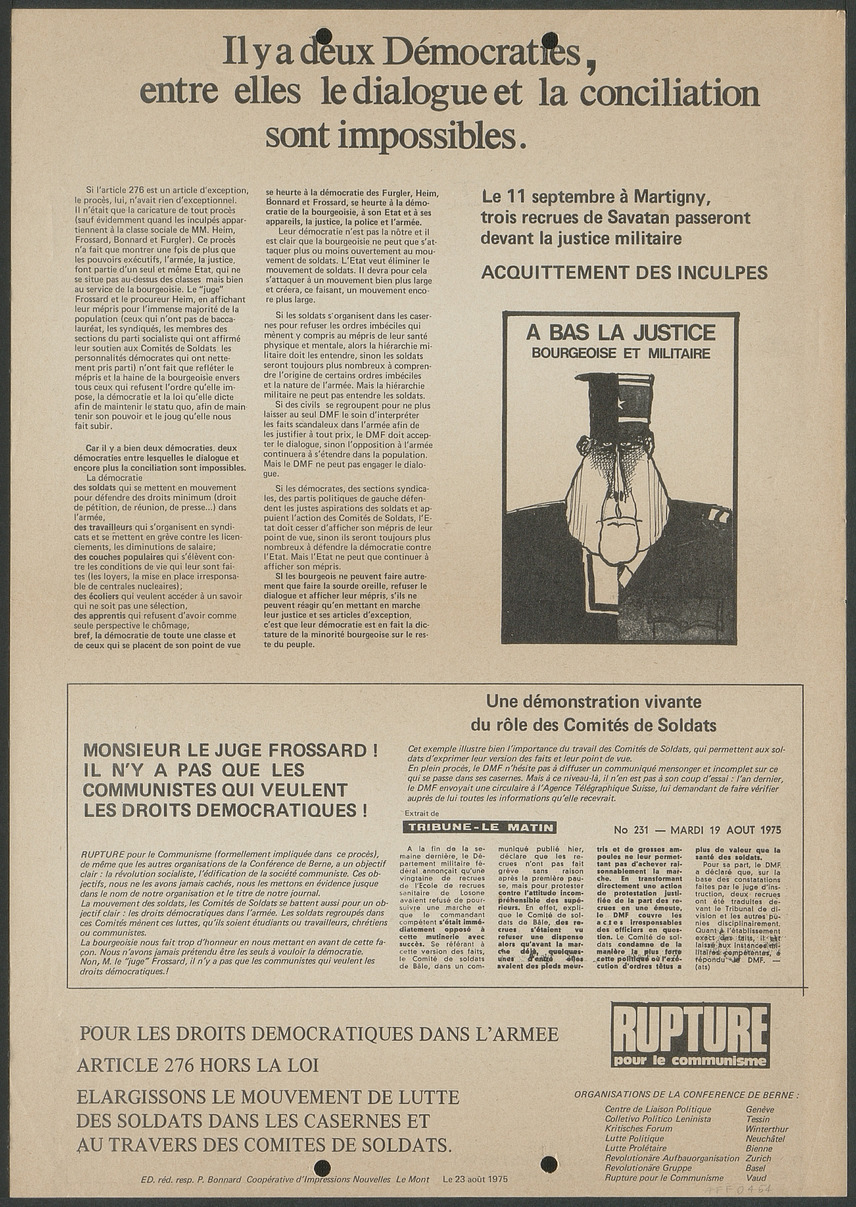 Information sur le procès de Alain Pélichet et Gaston Cherpillod, les éditeurs responsables des publications du Comité de Soldats de Lausanne, et sur la répression contre les comités de soldats.