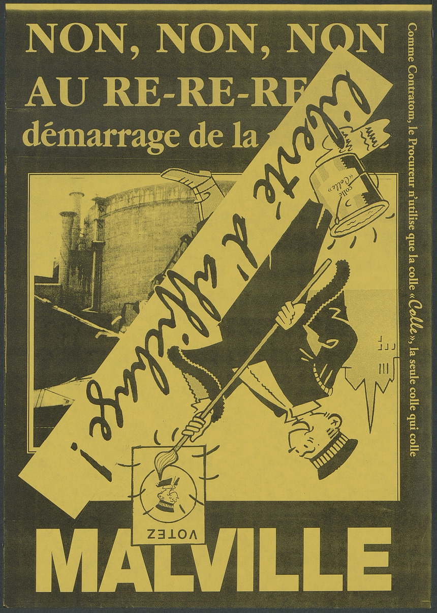 Affiche anti-nucélaire avec un collage du personnage dessiné par Exem pour l'affiche commandée par le Parti Socialiste genevois à l'occasion de l'élection du procureur général. Ce même personnage, représentant le procureur Bernard Bertossa, fut réutilisé par Exem dans une autre affiche, commandité par des amis squatters, et dénonçant l'attitude répressive de Bertossa vis à vis de ces derniers. (Source : Ariel Herbez, Affiches BD, 1996).