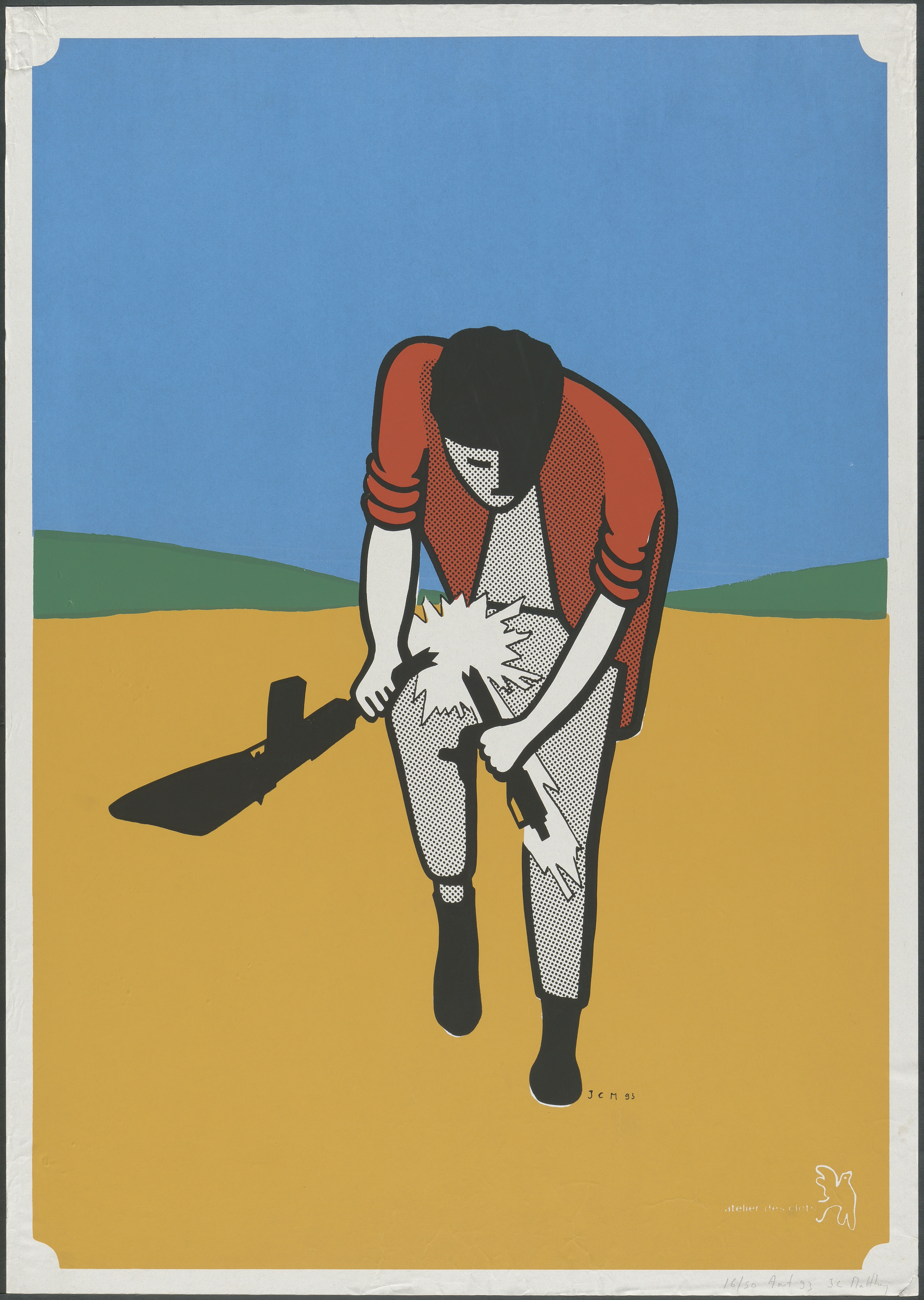 Affiche de Jean-Claude Matthey. Le dessin original Le mec qui casse un fusil date de 1983. Signée et numérotée 16/50.