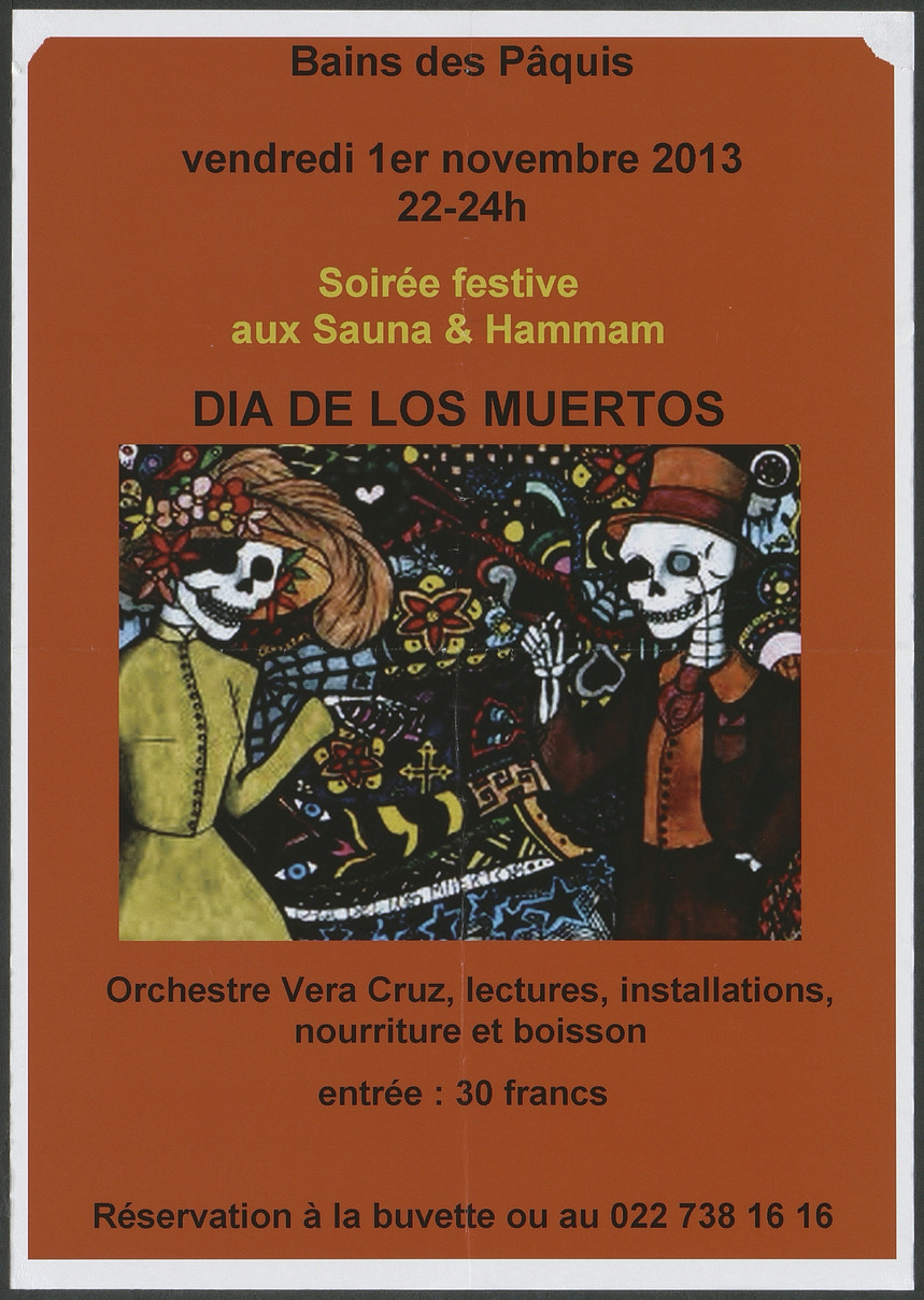Affiche pour une soirée à l'occasion du « Dia de los muertos [jour des morts] » avec orchestre, lectures, installations et restauration. Image représentant La Catrina, personnage de la culture populaire mexicaine, un squelette aux attributs féminins et aux habits bourgeois, portant un chapeau.