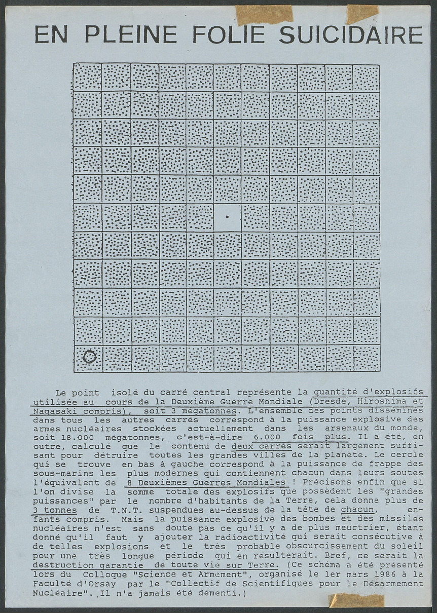 Affiche présentant un graphique qui représente « la quantité d'explosifs utilisés au cours de la Deuxième Guerre Mondiale » mis en comparaison avec « la puissance des armes nuclaires stockées actuellement dans les arsenaux du monde ». Graphique présenté en 1986 à la Faculté d'Orsay lors du colloque « Science et armement ».