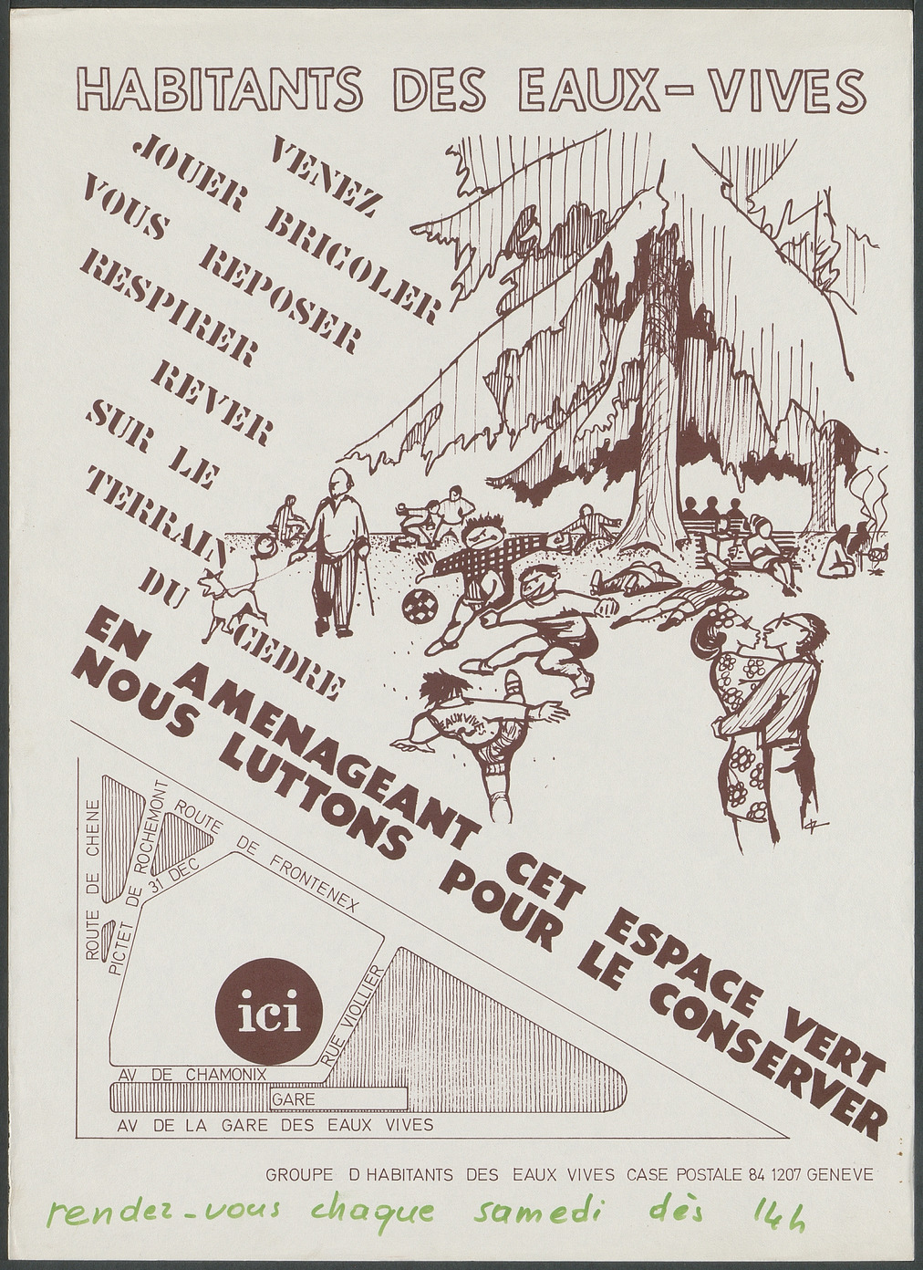 Affiche à venir chaque samedi après-midi pour défendre un espace vert situé entre l'avenue de Chamonix et la route de Frontenex.