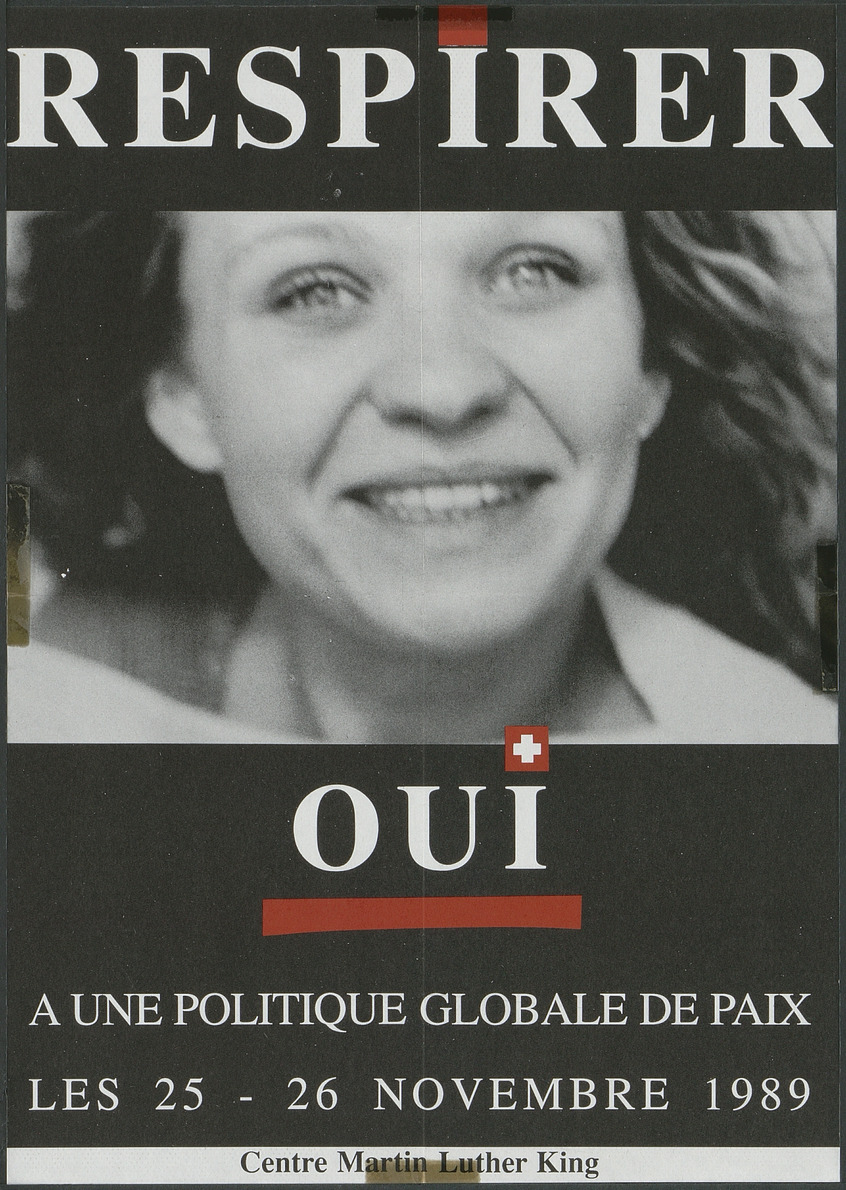 Affiche pour l'initiative Pour une Suisse sans armée et pour une politique globale de paix. Photographie d'une personne souriant.