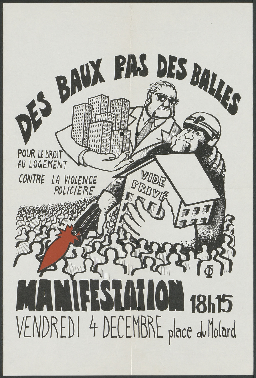 Affiche pour appeler à une manifestation le 4 décembre [1981] à la place du Molard "Pour le droit au logement, contre la violence policière". On y voit un policier tirer sur une foule pour l'empêcher d’accéder à un bâtiment qu'il tient d'une main où il est écrit "Vide privé". Derrière lui se tient un personnage dont on comprend qu'il est un promoteur immobilier, il a une main sur l'épaule du policier et l'autre bras occupé par plusieurs immeubles modernes.