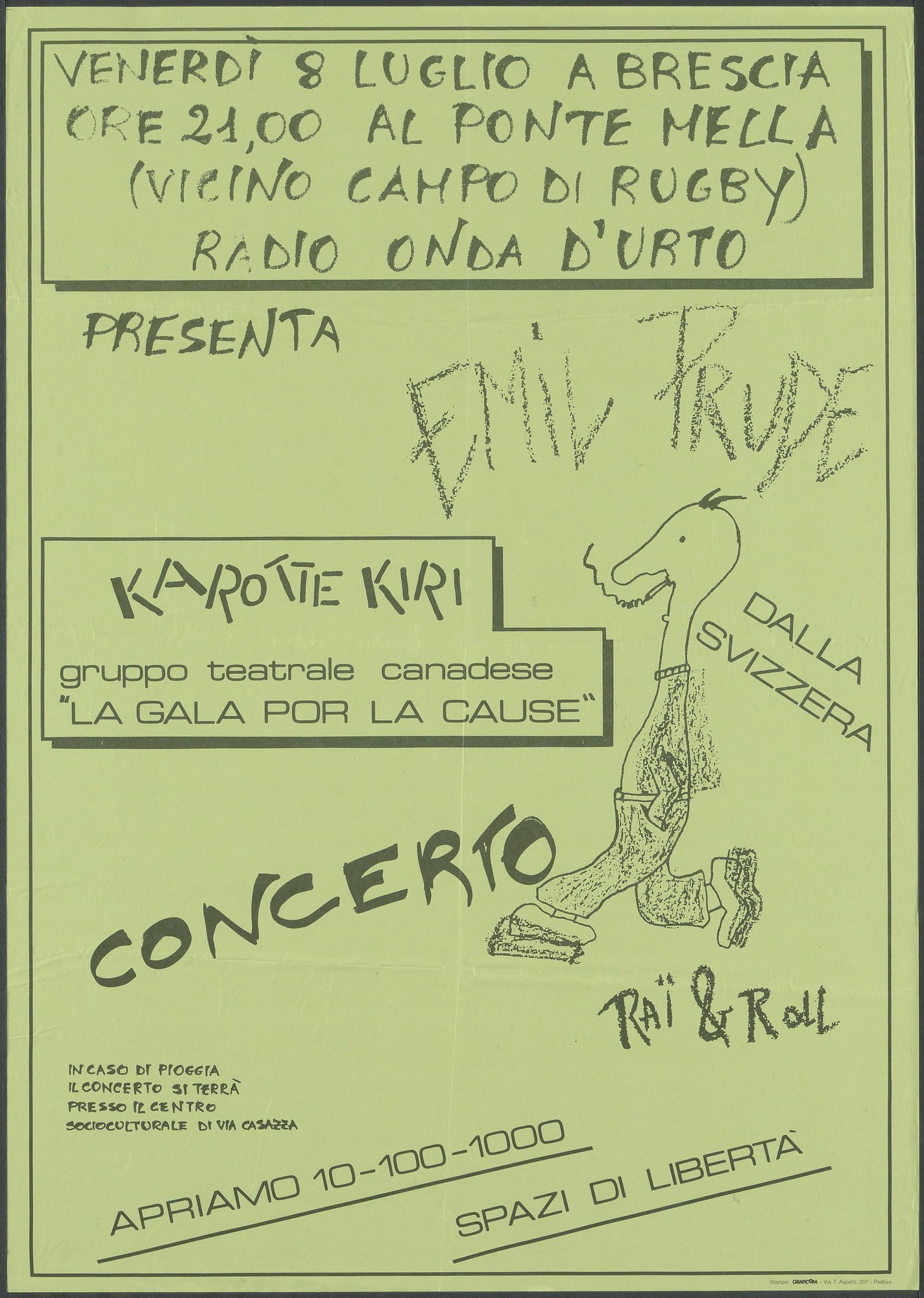 Affiche pour un concert de Emil Prude et Karotte Kiri organisé par Radio Onda d'Urto à Brescia. Dessin d'un personnage qui marche, de profil, fumant une cigarette.