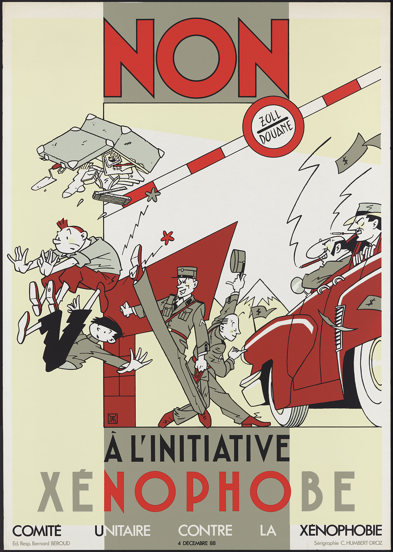 Affiche contre l'initiative populaire « pour la limitation de l'immigration ». L'affiche représente une caricature de Tintin et son ami Tchang qui se font expulser par un coup de pied au derrière de la part d'un douanier, tandis que son collègue laisse entrer une voiture avec plusieurs personnages connus pour être les « méchants » des albums d'Hergé.