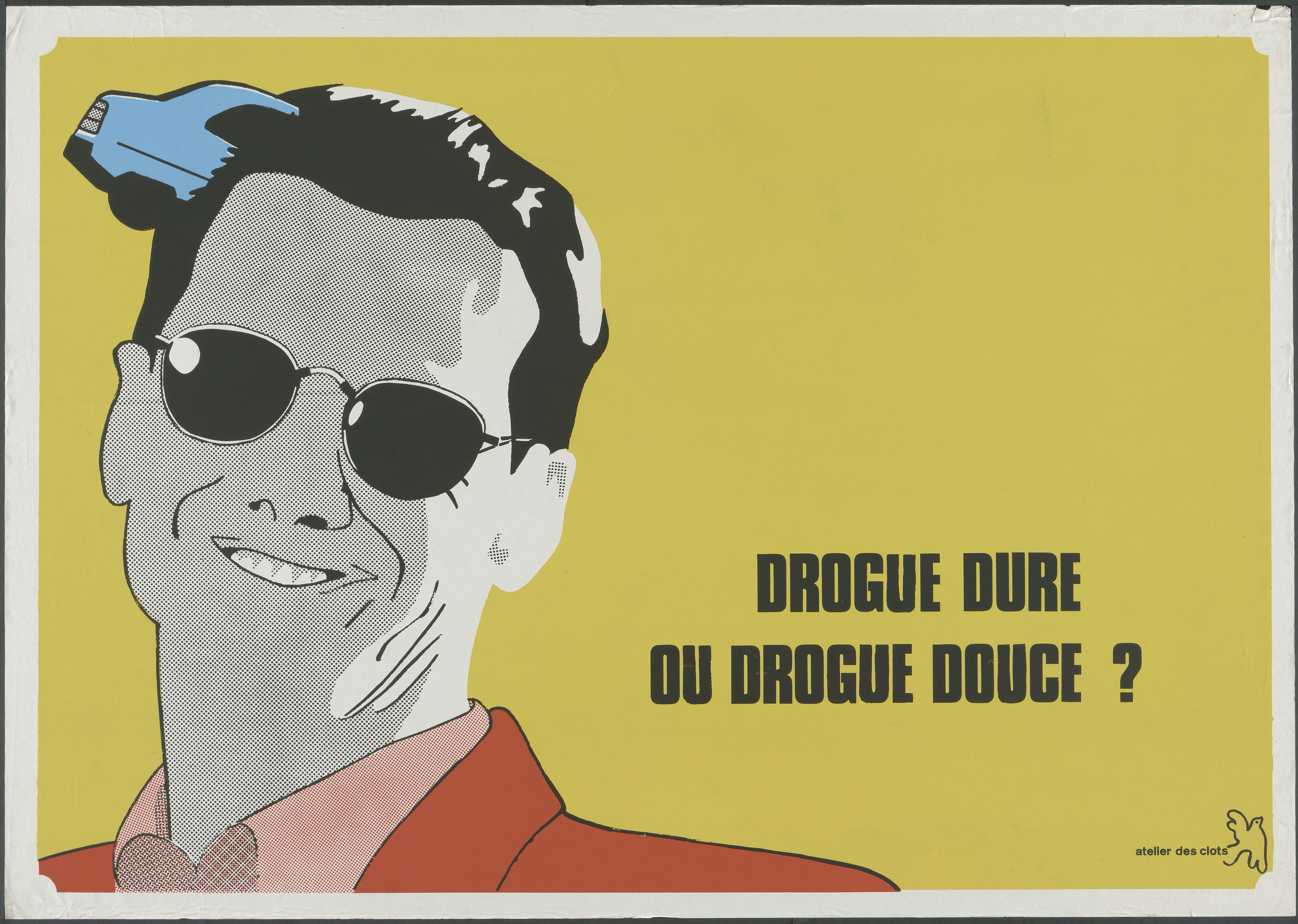 Affiche représentant un portrait d'homme souriant, portant des lunettes de soleil, avec une voiture enfoncée dans son pénétrant son crâne, côté gauche. Fond jaune. Possiblement faisant partie d'une série sur la consommation de drogue.