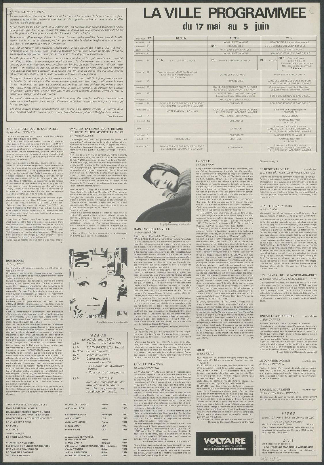 Affiche et programme pour le cycle de projection « La ville programmée » au cinéma Voltaire. Réflections sur la représentation de la ville à l'écran. Liste des films.