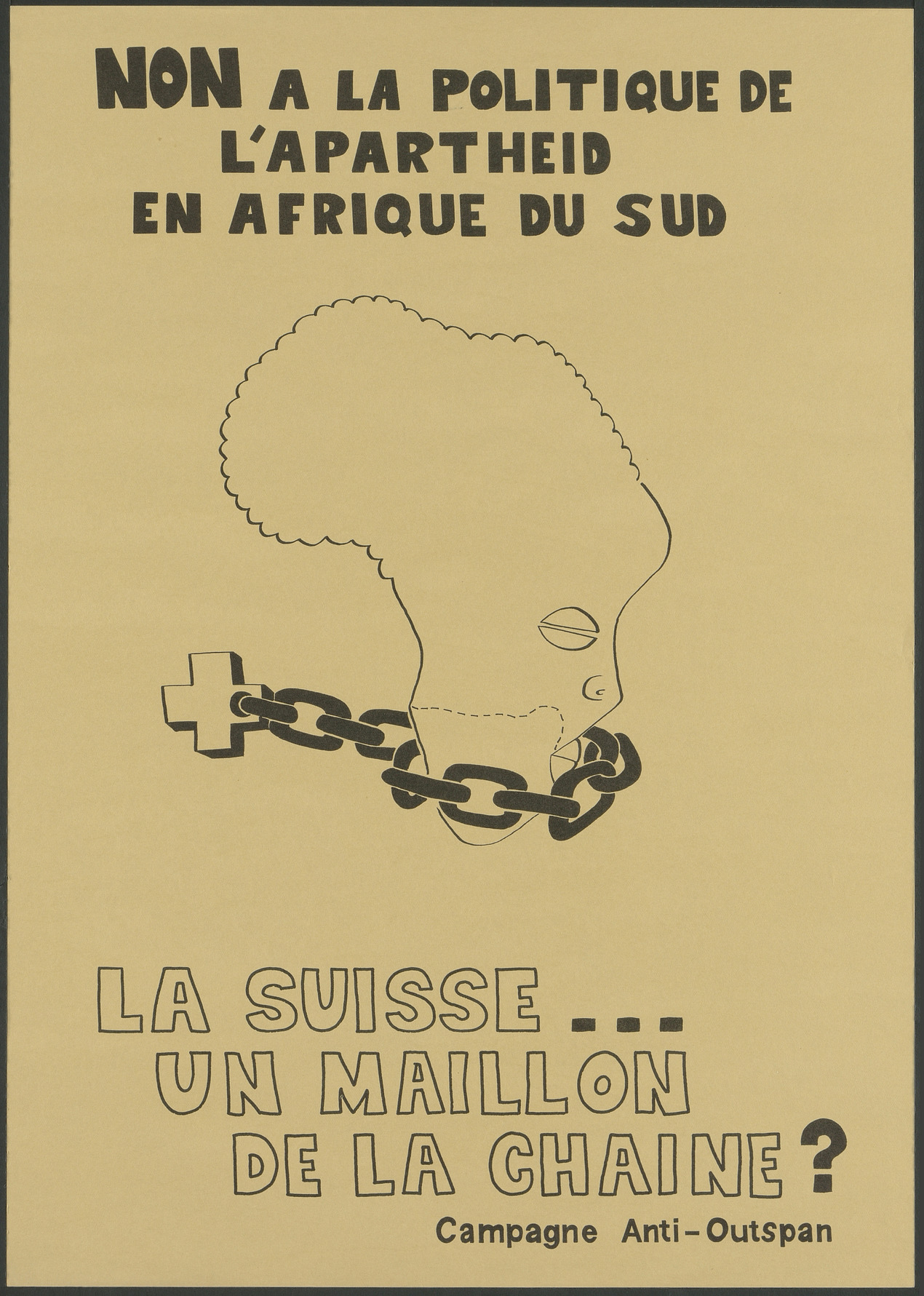 Affiche pour la campagne Anti-Outspan, campagne de boycott contre une marque d'oranges et d'agrumes sud africaine, symbole de l'exploitation des noirs par le régime sud-africain.