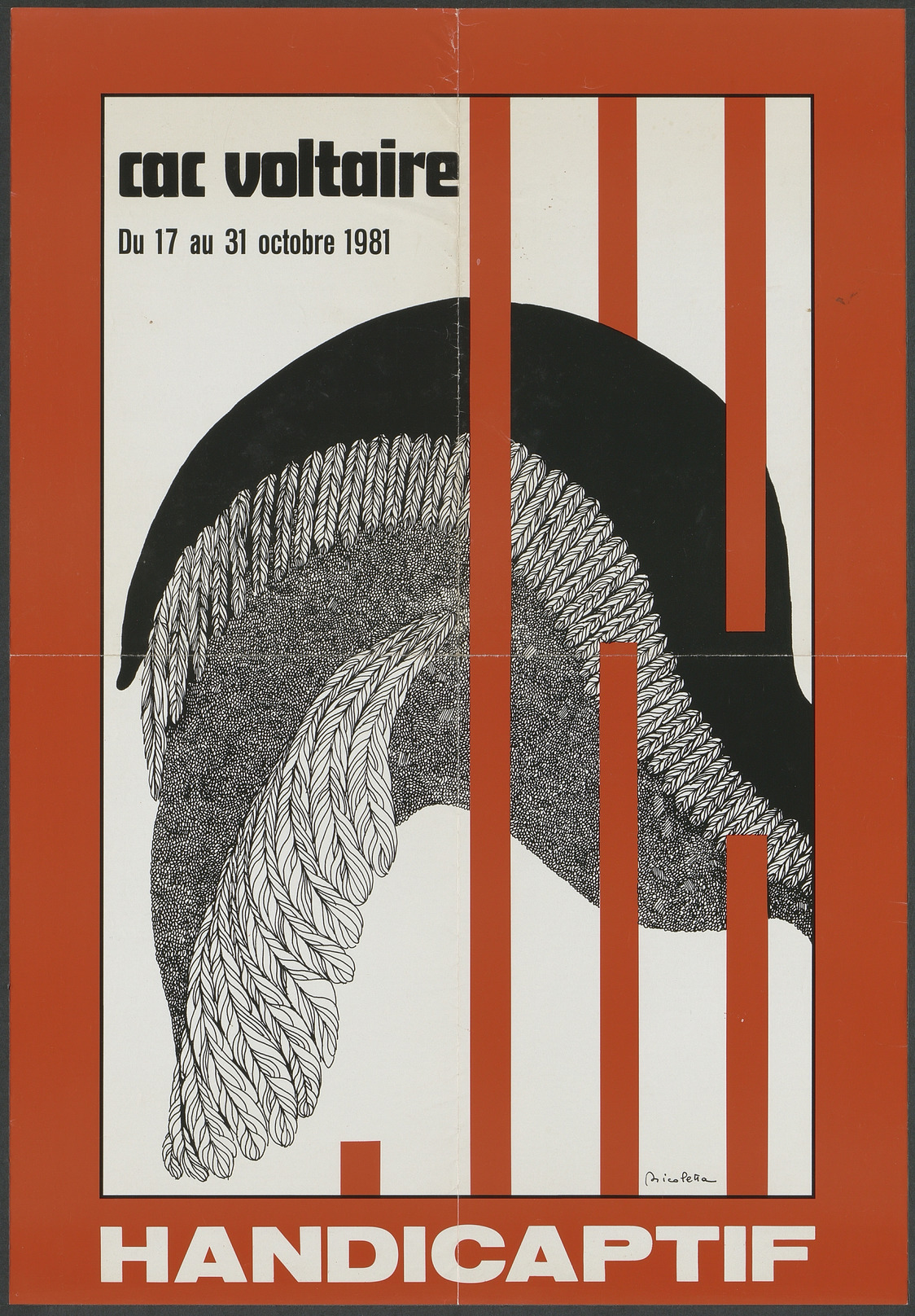 Affiche et programme pour un cycle de projections au cinéma CAC Voltaire à Genève, autour de la question du handicap. Image d'une aile d'oiseau à travers des barreaux. Liste et description des films au verso.
