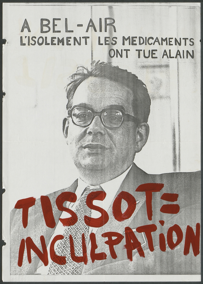 Photographie de René Tissot, directeur de la clinique psychiatrique de Bel-Air. Sur la photo il est écrit « À Bel-Air l'isolement les médicaments ont tué Alain » et « Tissot = inculpation ». Alain Urban est décédé à 27 ans à Bel-Air.