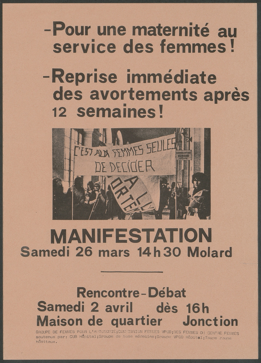 Appel à une manifestation et à une rencontre-débat pour "une maternité au service des femmes" et "la reprise immédiate des avortements après 12 semaines". L'appel est illustré par une photographie d'une banderole, tenue par des femmes, où l'on peut lire "c'est aux femmes seules de décider".