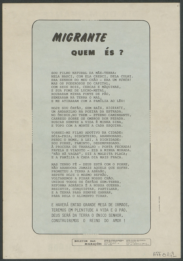 Images d'hommes, femmes et enfants suivant un troupeau de bêtes qui brise une barrière de barbelés pour rejoindre la nature. Carte du Brésil dans le fond. Texte en portugais au verso.