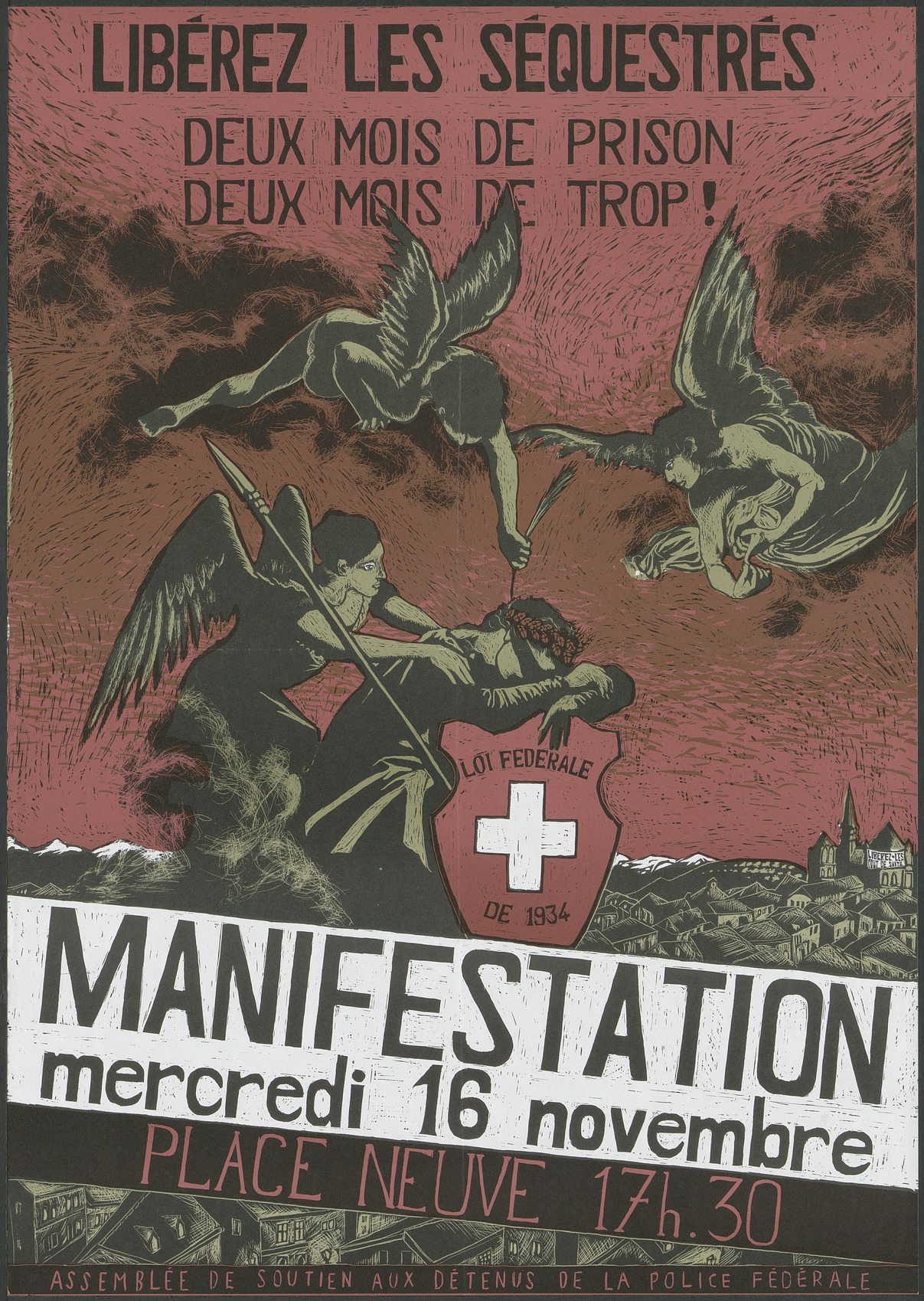 Affiche pour une manifestation en soutien aux « quatre séquestrés de la police fédérale » à Genève. L'affiche représente Helvetia, la tête dans ses bras, appuyée sur un écusson suisse sur lequel se trouve inscrit « loi fédérale de 1934 » (référence à la loi fédérale sur la procédure pénale). Trois anges l'entourent, essayant de la consoler.