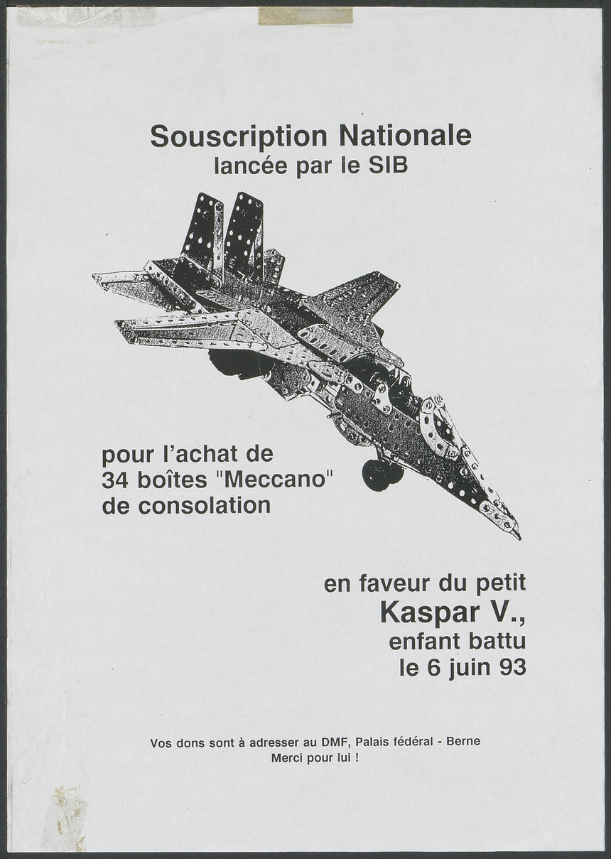 Affiche simulant la victoire dans le cadre de l'initiative Pour une Suisse sans nouveaux avions de combat, lançant un appel à don dans , « pour l'achat de 34 boites "Meccano" de consolation » pour « Kaspar V, enfant battu ». Kaspar Villiger est conseiller fédéral en charge de la défense et soutient activement l'achat des nouveaux F/A-18.