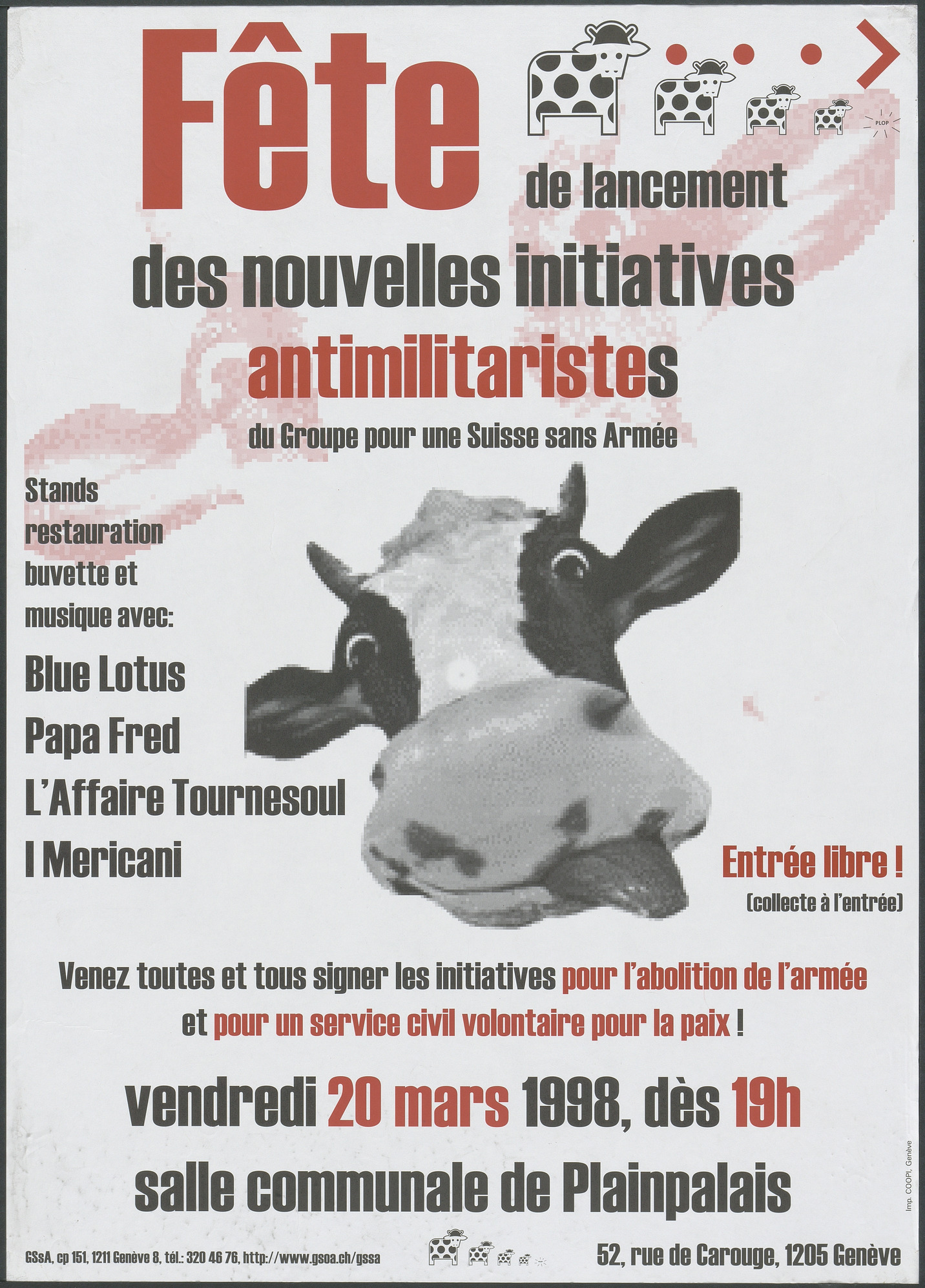 Affiche pour une fête de lancement de l'initiative « Genève, République de paix » par le GSSA à la salle communale de Plainpalais. Récolte de signatures. Image d'une tête de vache qui tire la langue au milieu de l'affiche.