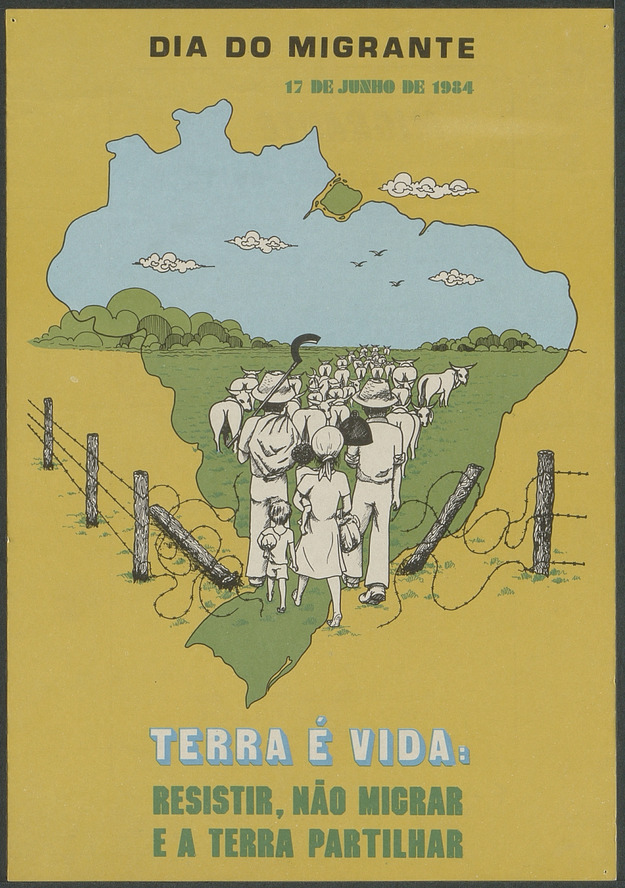 Images d'hommes, femmes et enfants suivant un troupeau de bêtes qui brise une barrière de barbelés pour rejoindre la nature. Carte du Brésil dans le fond. Texte en portugais au verso.