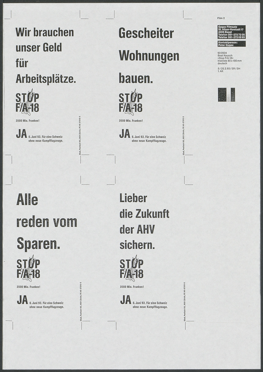 « Wir brauchen unser Geld für Arbeitsplätze », « Gescheiter Wohnungen bauen », « Alle reden vom Sparen », « Lieber die Zukunft der AHV sichern ».
