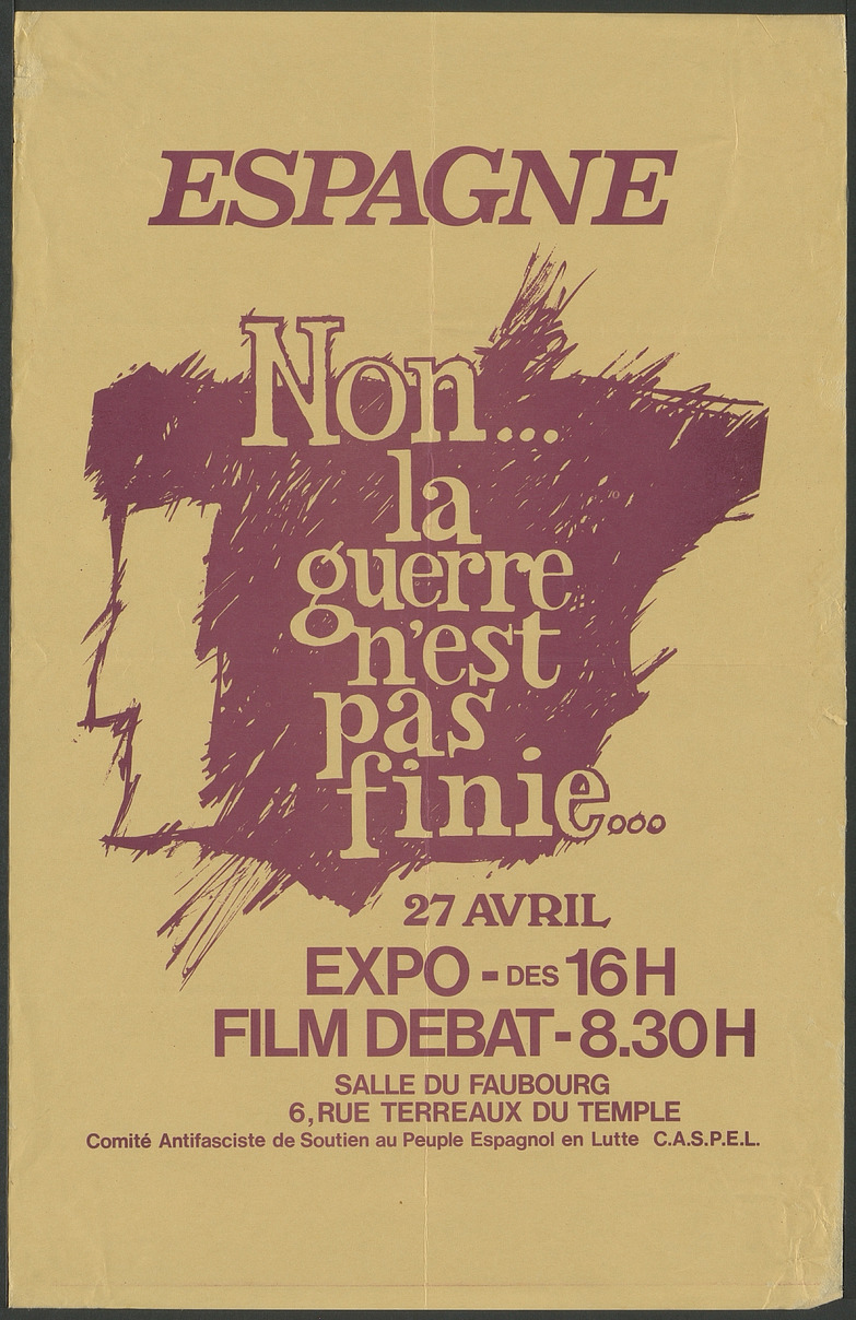 Affiche pour une exposition et un film et débat sur les luttes antifascistes en Espagne, à la salle du Faubourg à Genève.