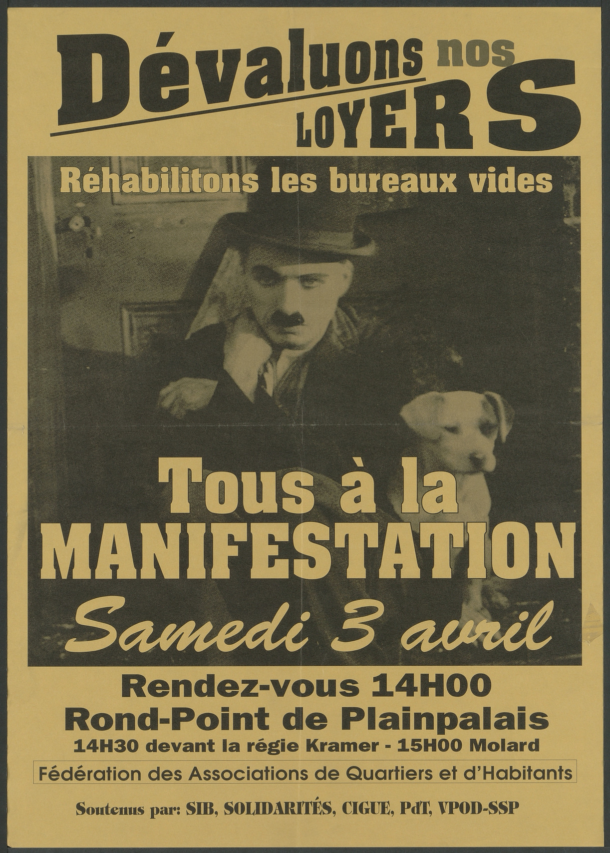 Affiche appelant à une manifestation sur le thème du logement, et notamment des espaces de bureau vides à Genève. Photographie représentant Charlie Chaplin dans