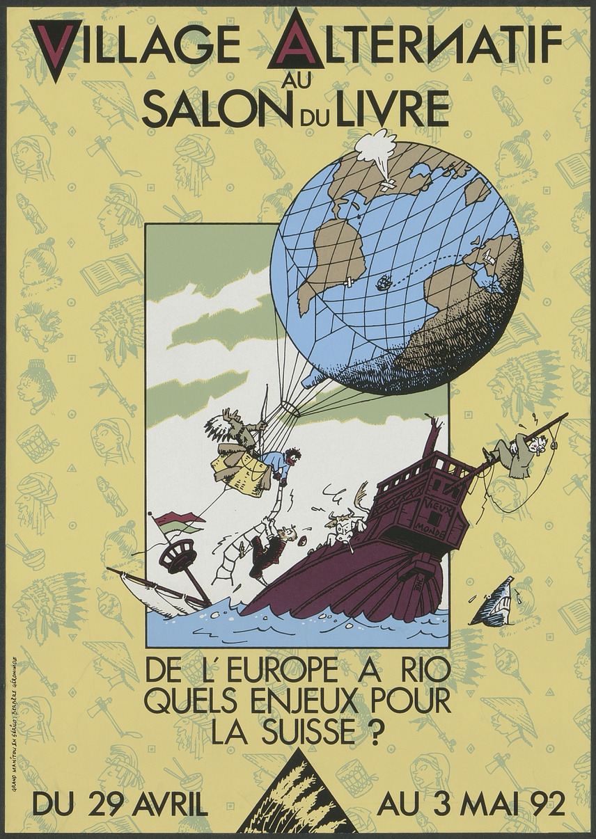 Affiche pour le Village alternatif du Salon du livre de Genève, représentant une montgolfière en forme de globe terrestre venant au sauvetage d'un navire de guerre baptisé « Vieux Monde ».