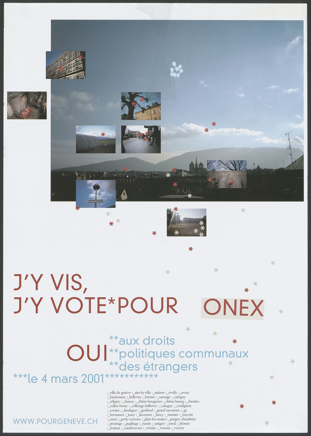 Affiche pour l'initiative populaire visant à octroyer le droit de vote au niveau communal pour les étrangers domiciliés sur le territoire cantonal. Affiche pour la commune de Onex.