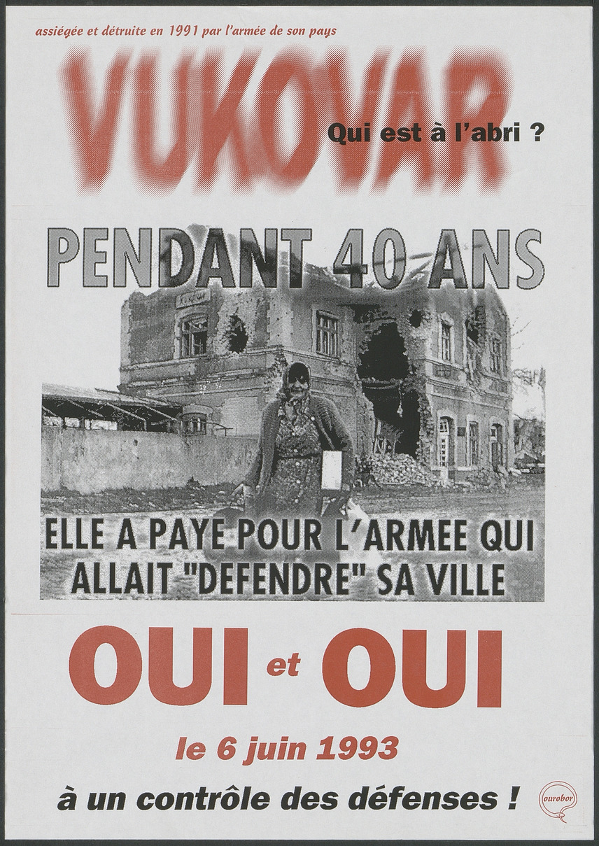 Affiche pour soutenir les deux initiatives populaires 40 places d'armes ça suffit! et Pour une Suisse sans nouveaux avions de combat. Photographie d'une femme quittant une maison en ruine, visiblement bombardée.