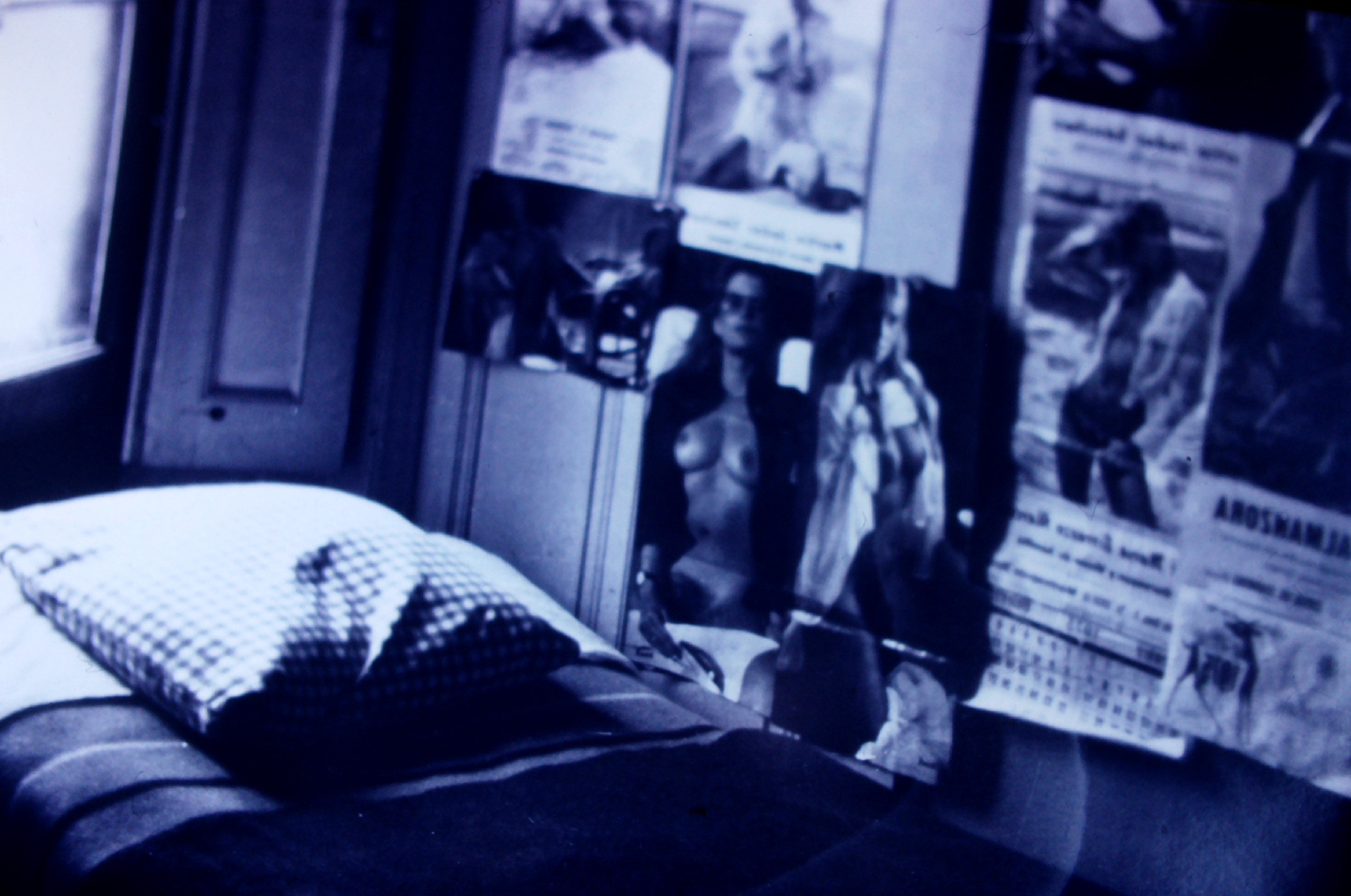 French » [Lit simple, une armoire, photographies pornographiques fixées sur l'armoire]