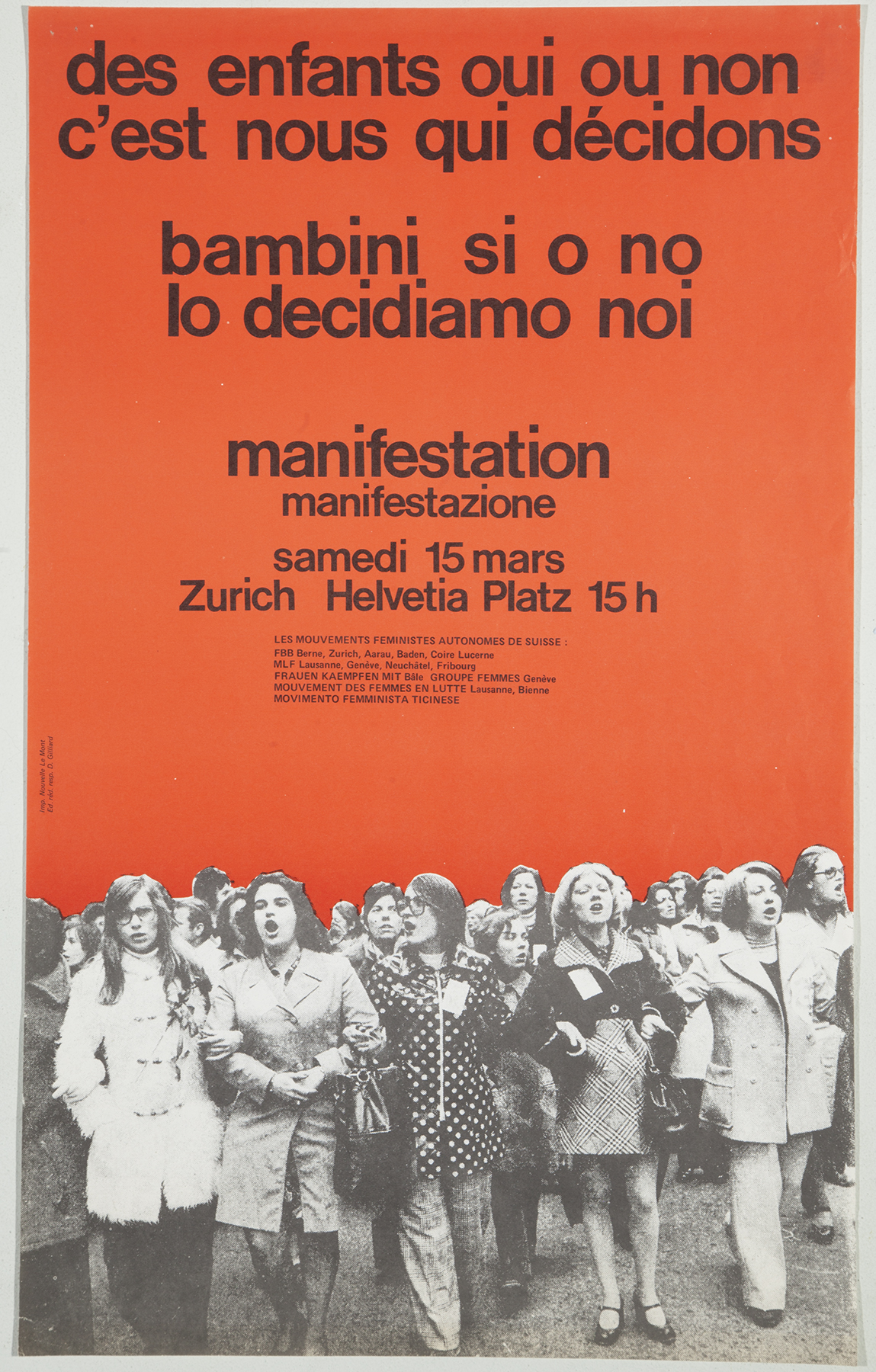 Il s'agit d'une affiche (rouge, noir et niveaux de gris sur papier blanc) appelant à une manifestation nationale sur l'avortement le 15 mars 1975 à Zurich.