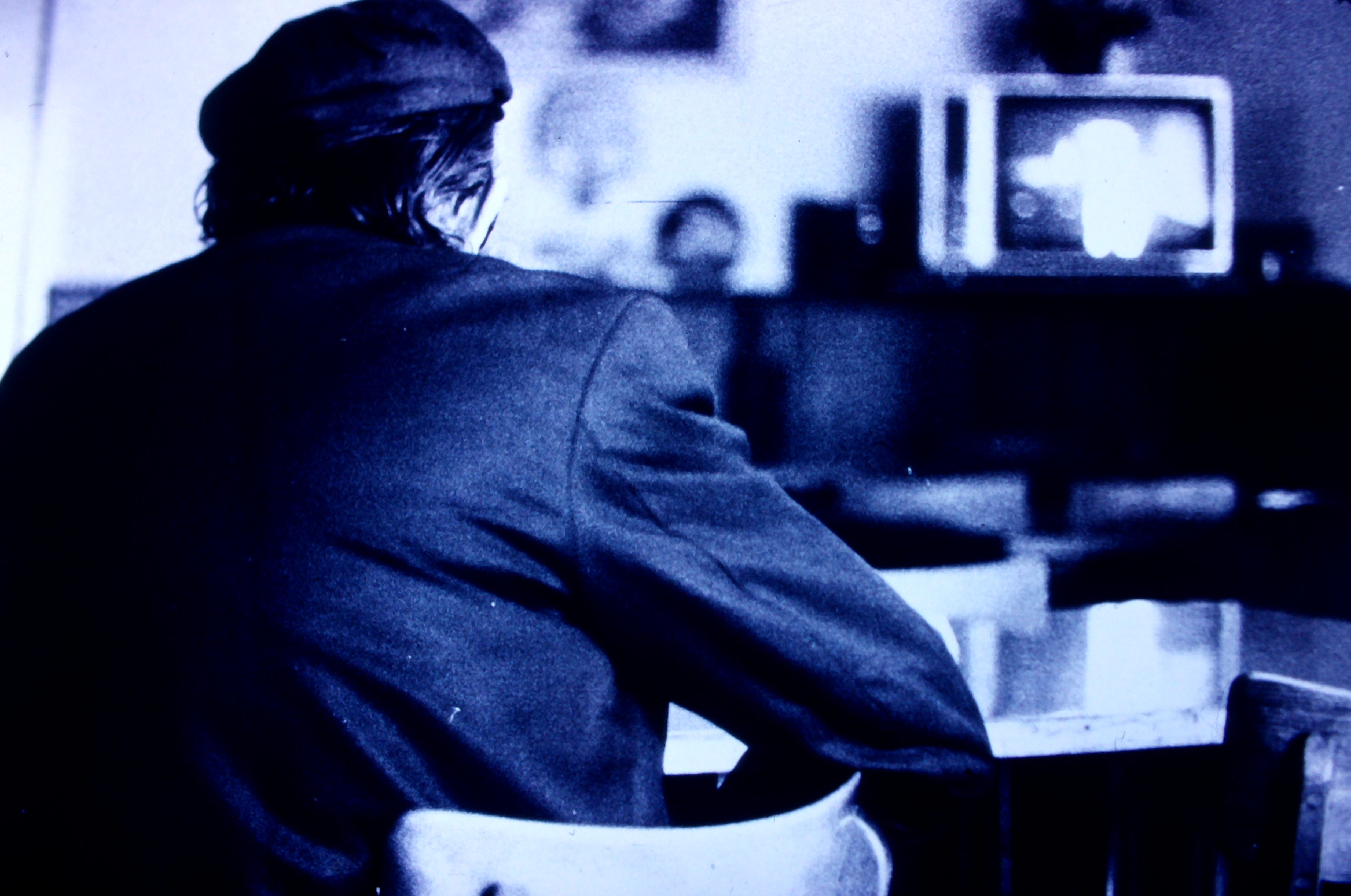 [Une personne de dos regarde la télévision dans un restaurant]