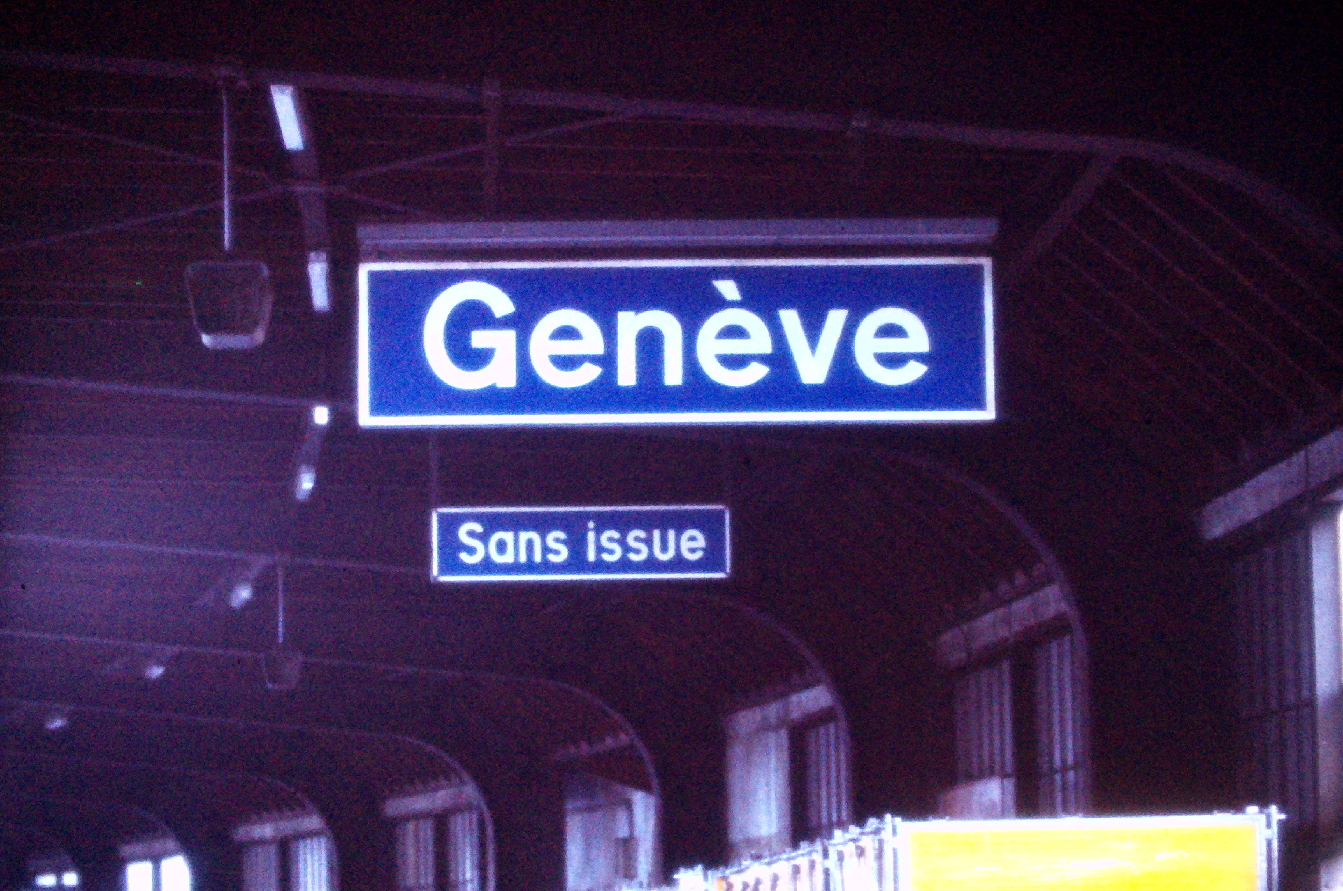 [Panneau annonçant la gare de Genève au-dessus d'un panneau indiquant «sans issue»]